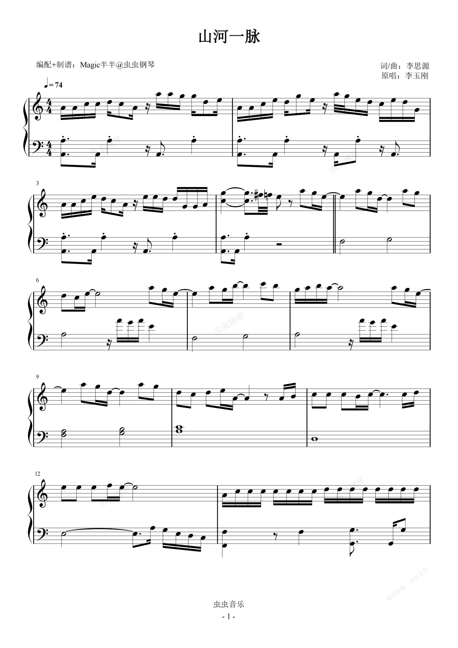 钢琴谱:山河一脉 李玉刚(C调完整版)