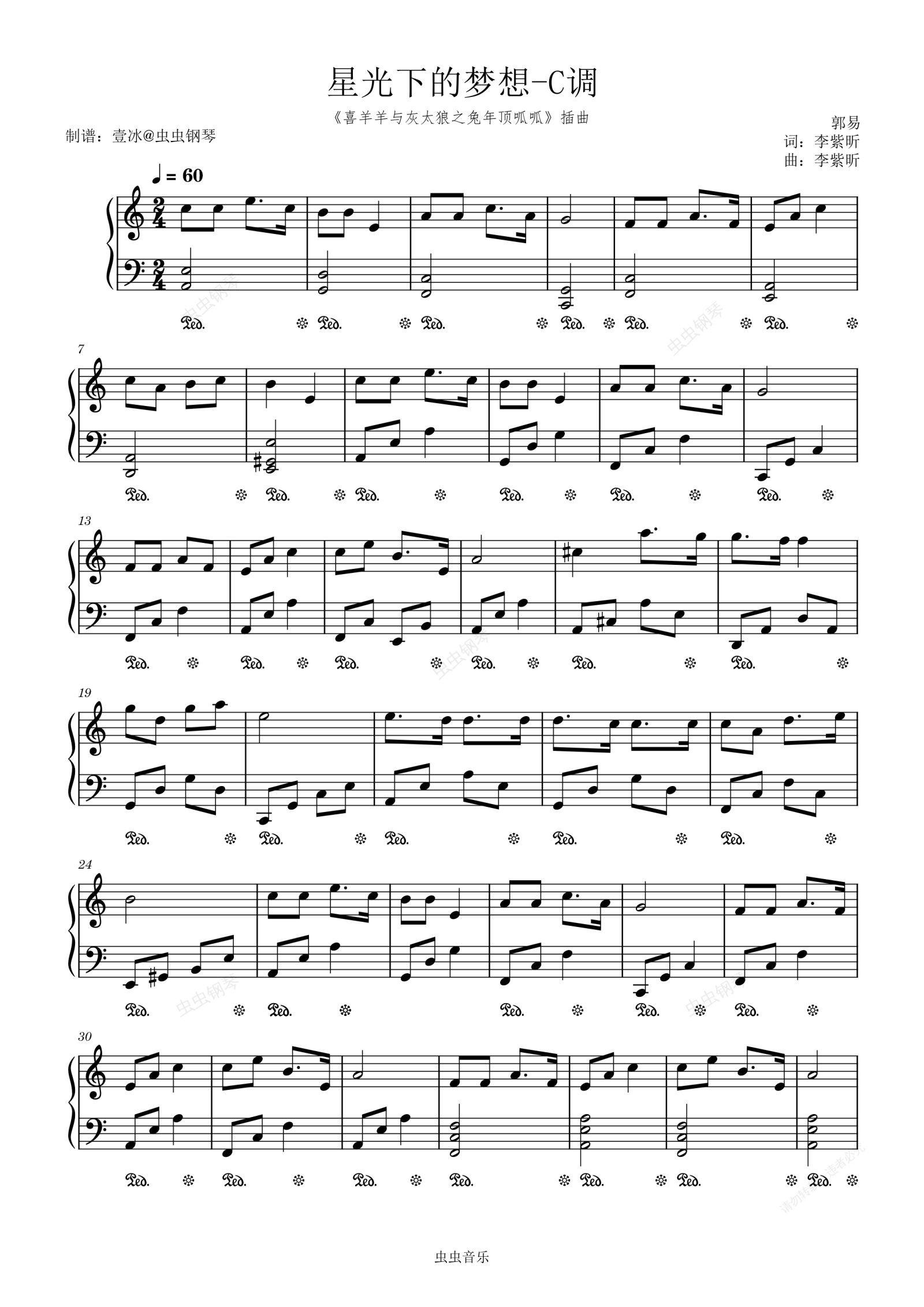 钢琴谱:星光下的梦想//《喜羊羊与灰太狼之兔年顶呱呱》插曲-C调