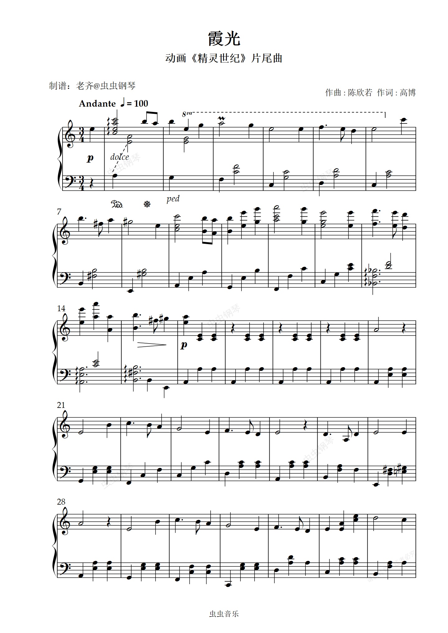钢琴谱:《霞光》动画《精灵世纪》片尾曲