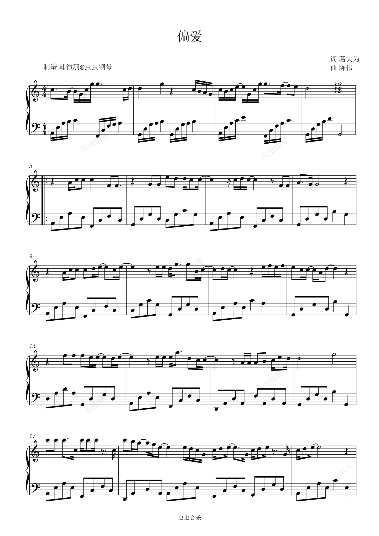 钢琴谱:偏爱 张芸京 好听易弹C调
