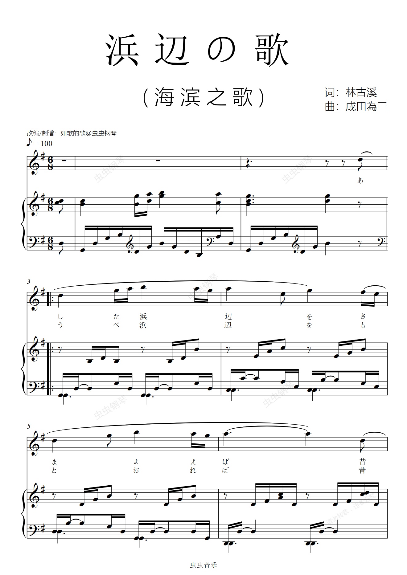 钢琴谱:浜辺の歌(海滨之歌)旋律+钢伴/央视“气象信息”配乐