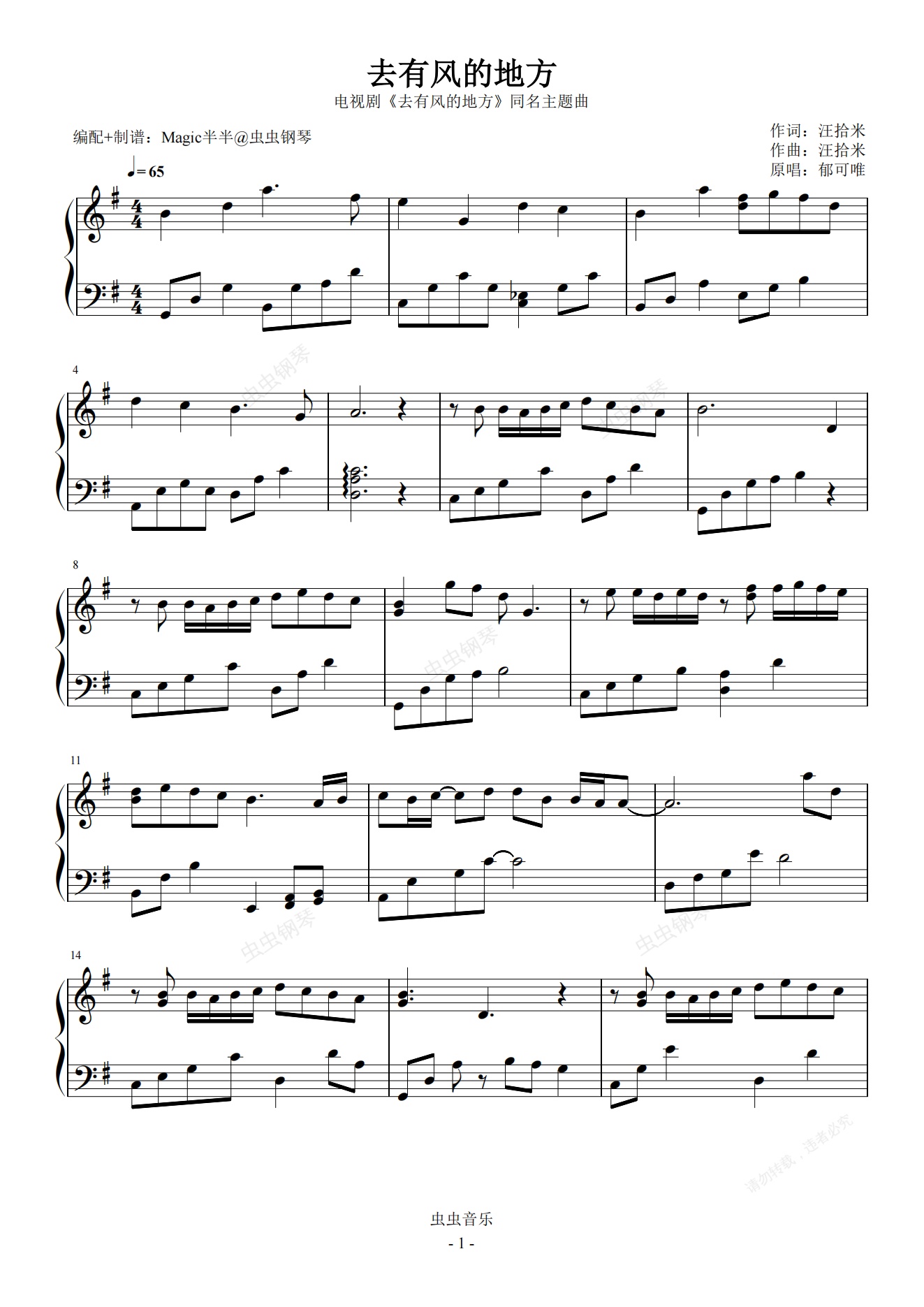 钢琴谱:<去有风的地方>同名主题曲 郁可唯