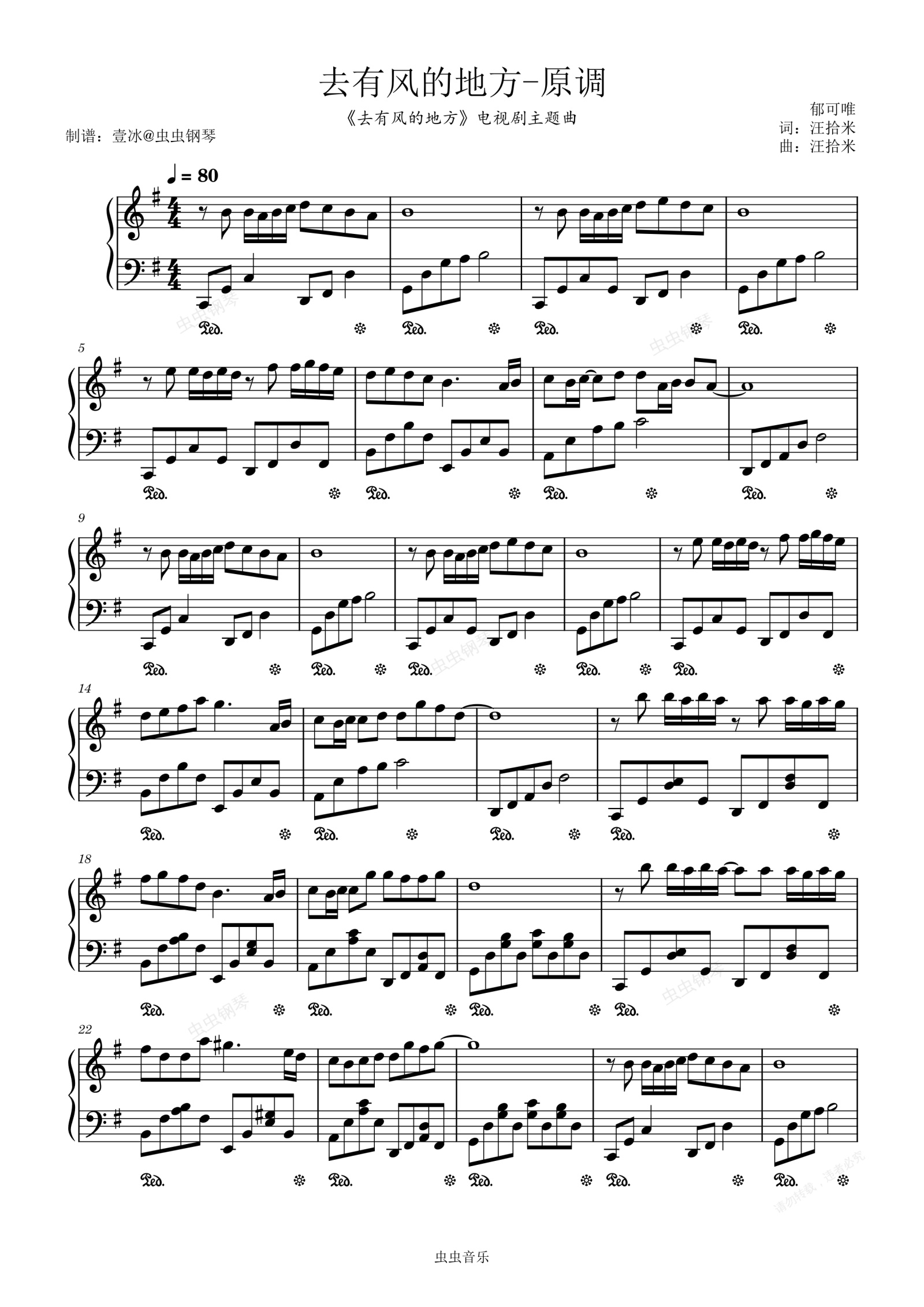 钢琴谱:去有风的地方 (《去有风的地方》电视剧主题曲) - 原调