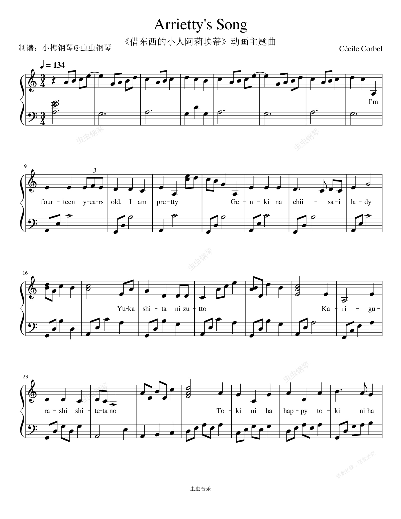 钢琴谱:Arrietty's Song 《借东西的小人阿莉埃蒂》动画主题曲