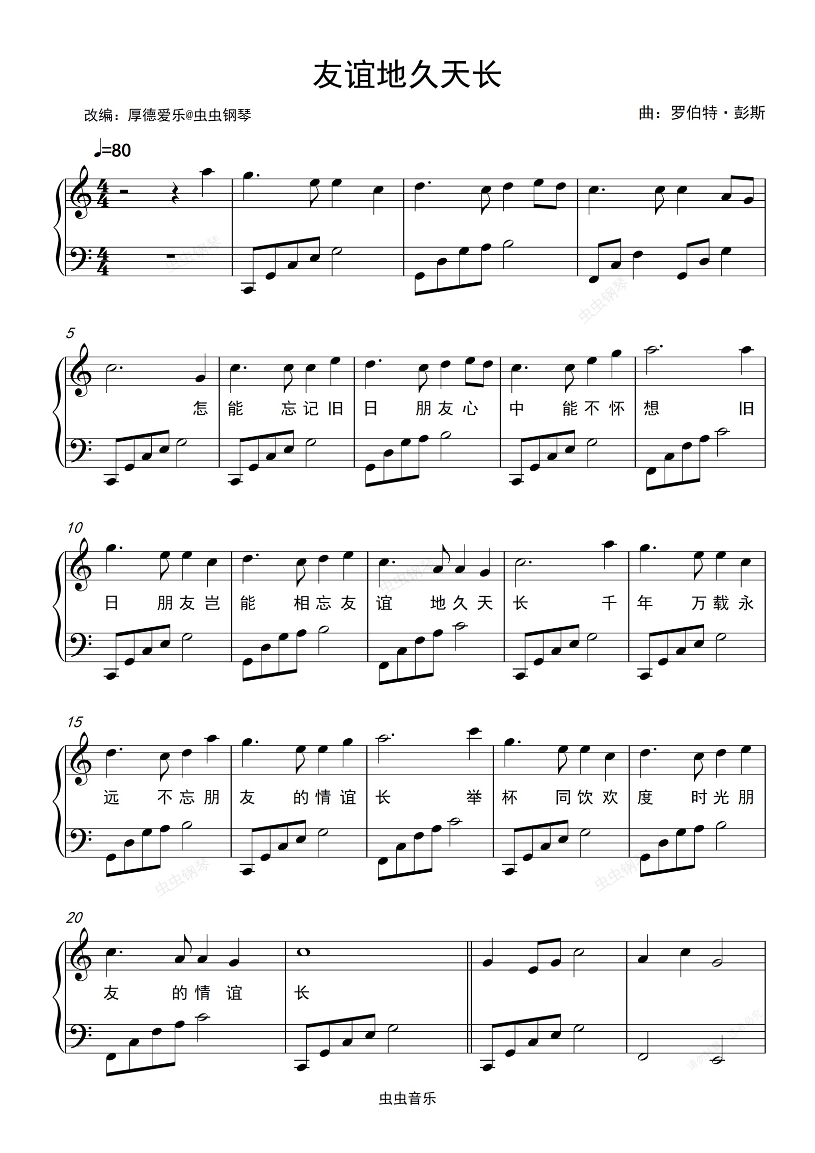 钢琴谱:《友谊地久天长》初阶版带歌词