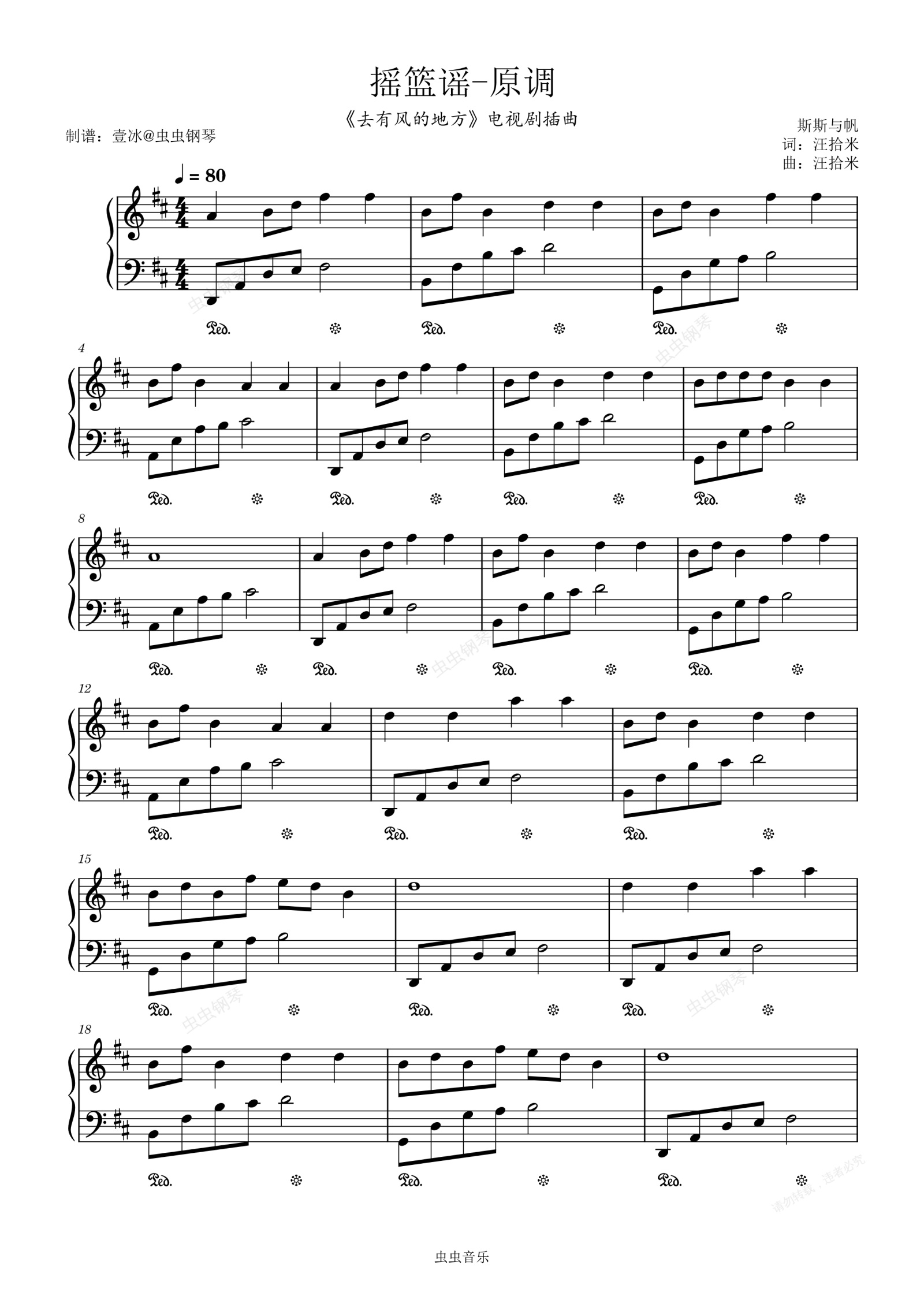 钢琴谱:摇篮谣 (《去有风的地方》电视剧插曲) - 斯斯与帆 原调