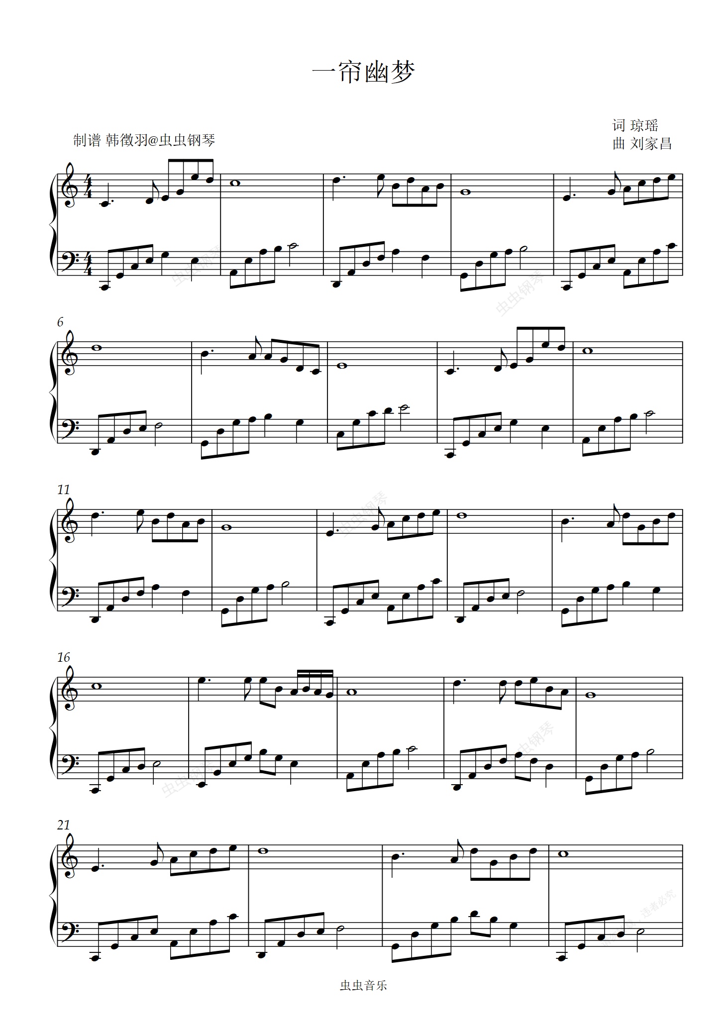 钢琴谱:一帘幽梦 C调 简单易弹