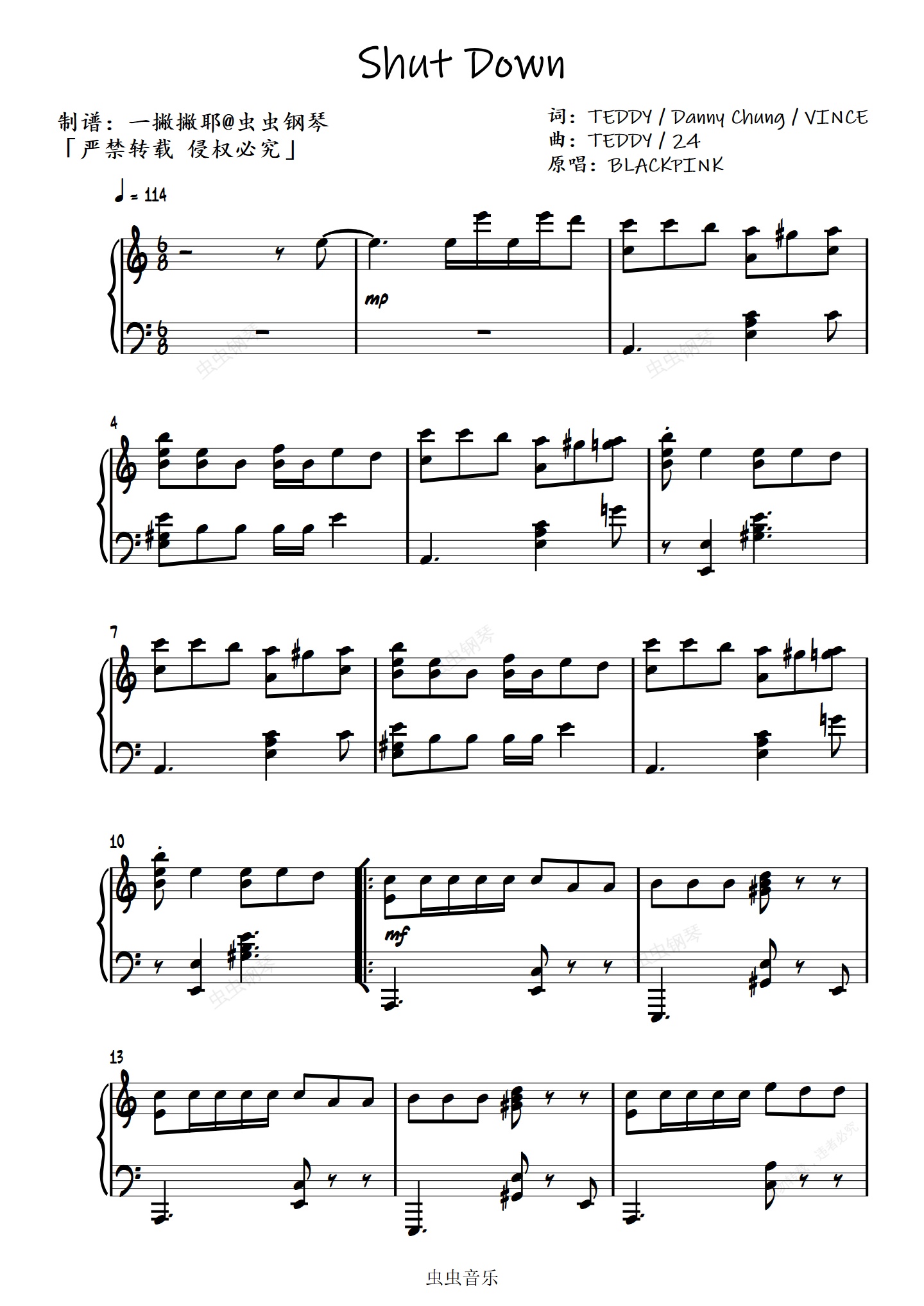 钢琴谱:C调独奏《Shut Down》BLACKPINK「一撇撇耶」