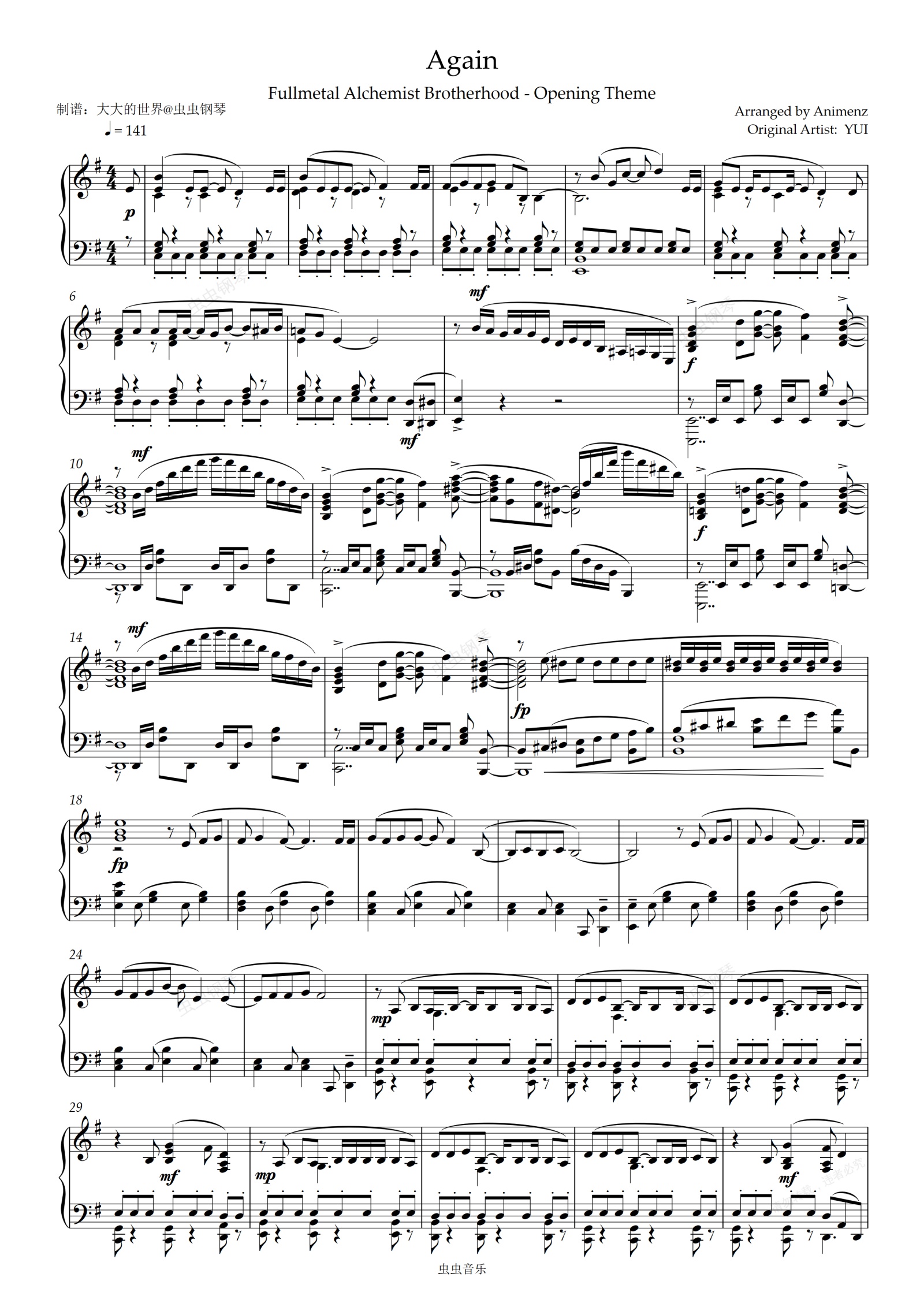 钢琴谱:again (《钢之炼金术师 FULLMETAL ALCHEMIST》TV动画第1-14集片头曲) - YUI (ユイ)