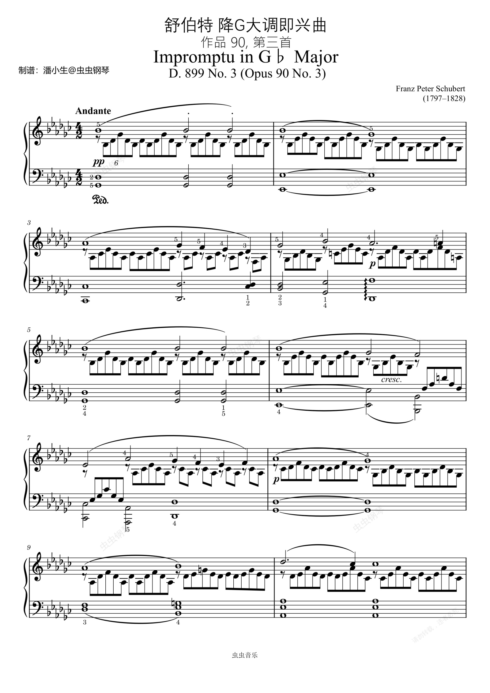 钢琴谱:舒伯特,降G大调即兴曲,原版重制带指法,Impromptu D.899 Op.90 No.3 in G♭ Major,作品 90, 第三首
