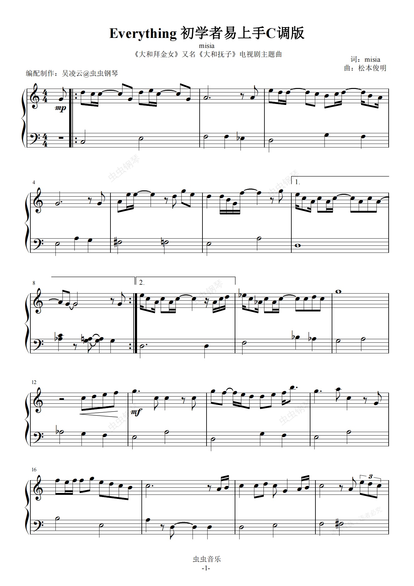 钢琴谱:Everything-misia 初学者易上手C调版  《大和拜金女》又名《大和抚子》电视剧主题曲