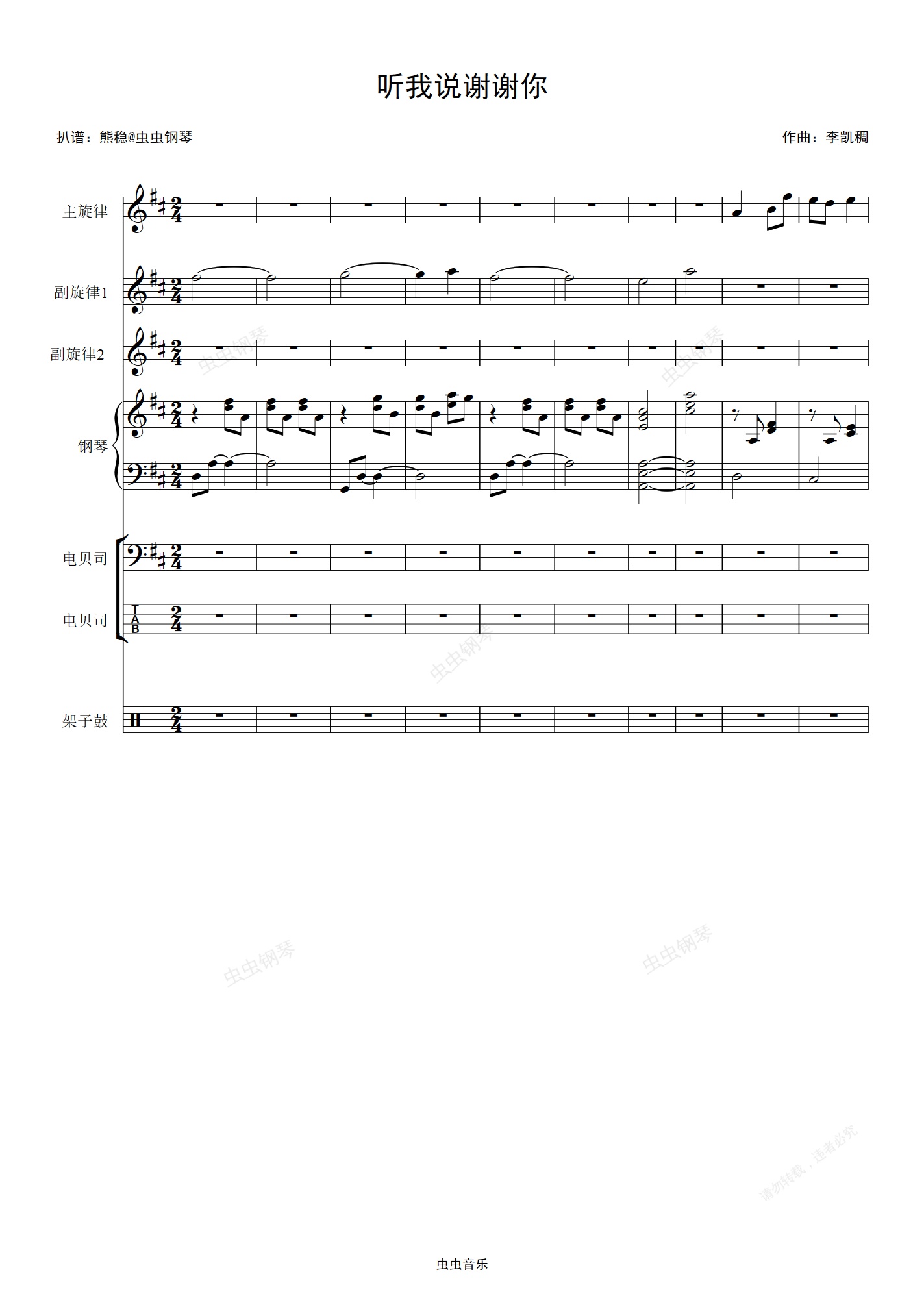 钢琴谱:《听我说谢谢你》D调总谱,非常适合器乐合奏的曲目
