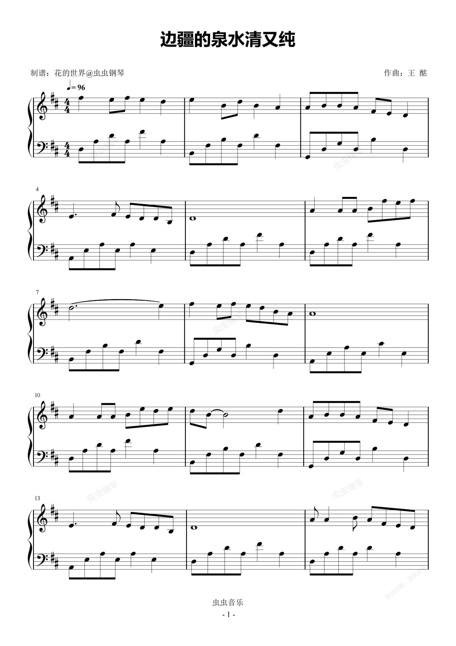 钢琴谱:边疆的泉水清又纯 原调简易版 李谷一 流行经典