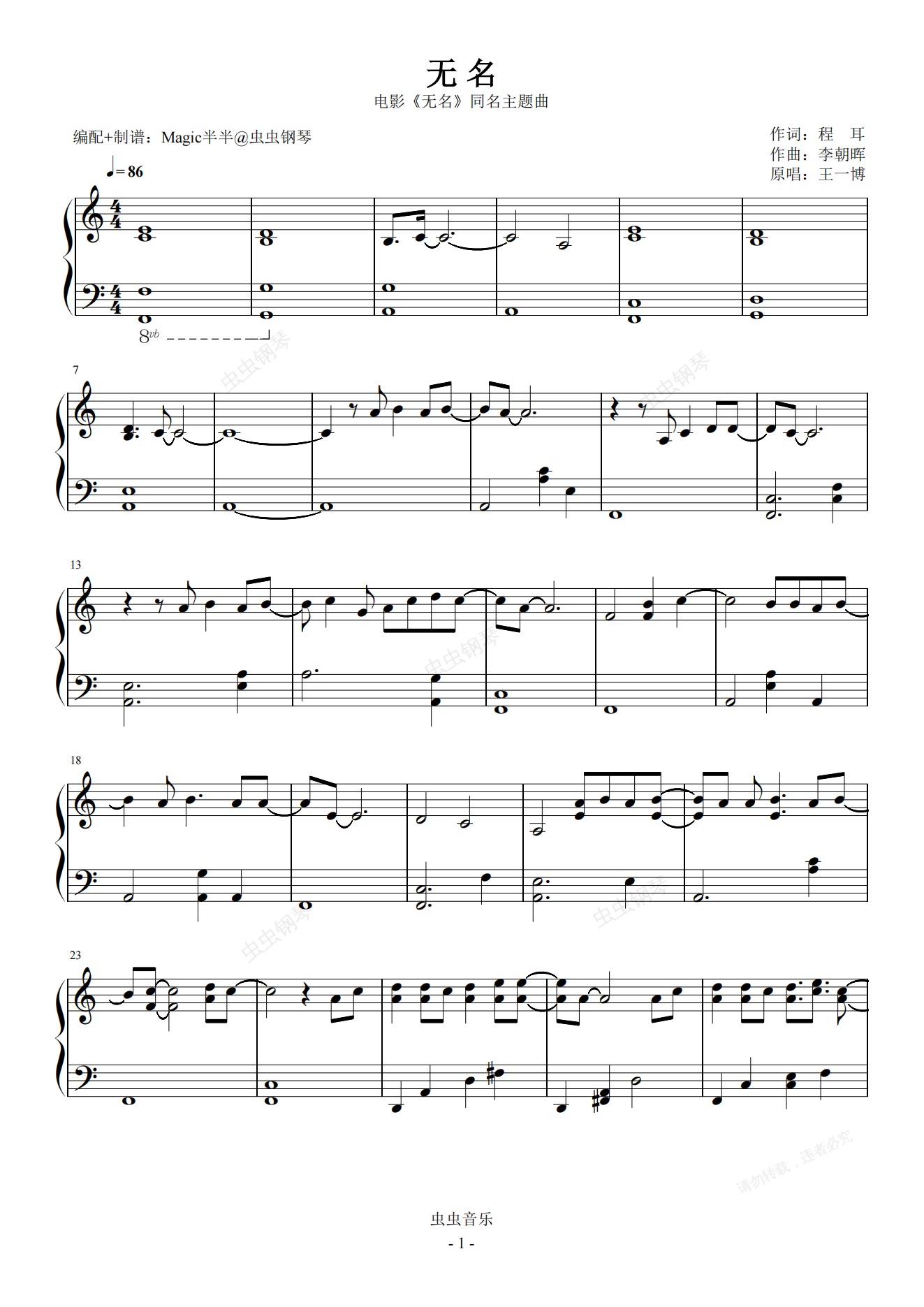 钢琴谱:<无名>电影同名主题曲 王一博