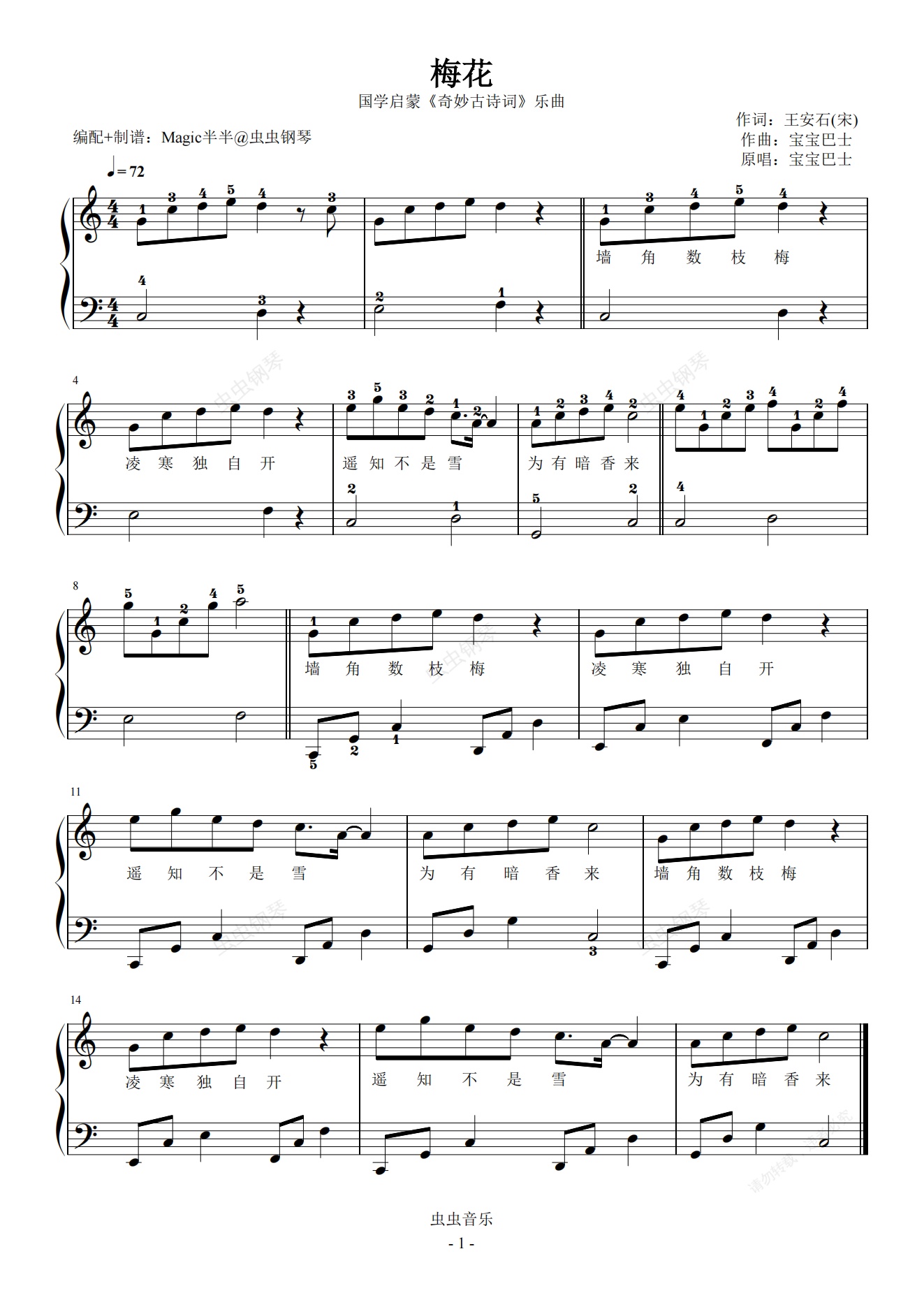 钢琴谱:奇妙古诗词/梅花(带指法)