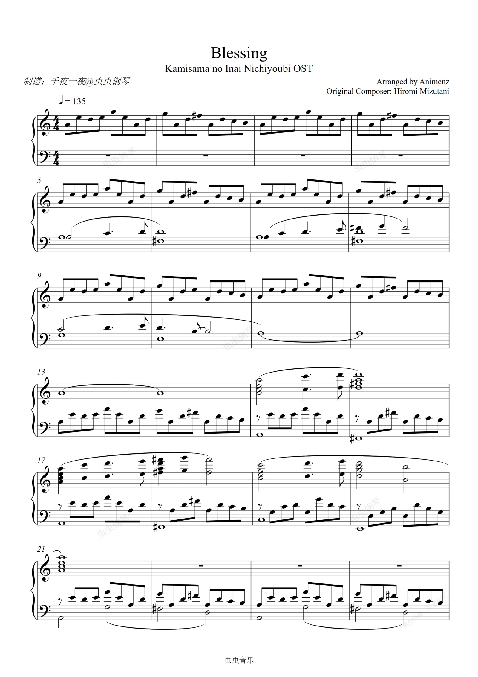 钢琴谱:【Animenz】Blessing 神不在的星期天OST 钢琴独奏