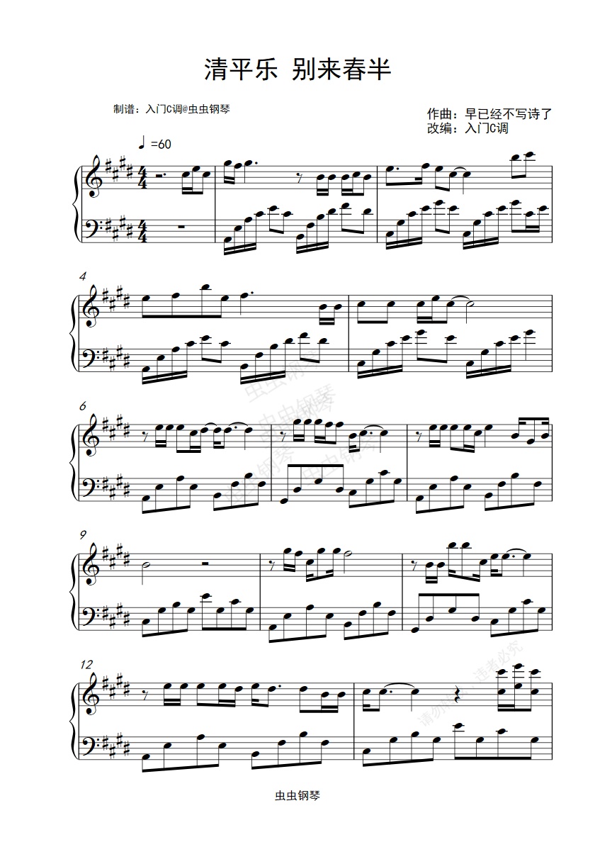 钢琴谱:早已经不写诗了《清平乐·别来春半》原调简单版