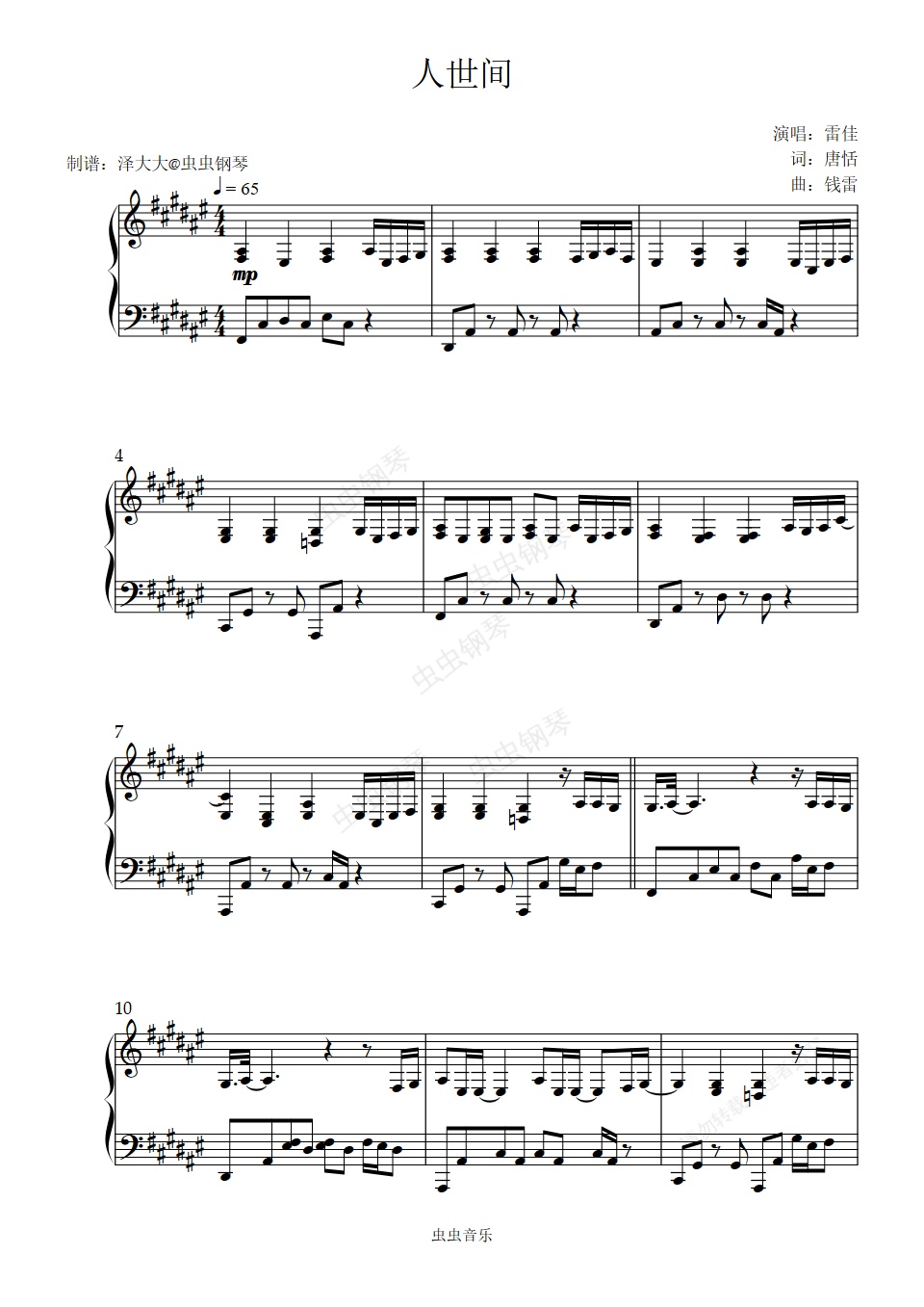 钢琴谱:人世间【完美独奏版】泽大大 雷佳