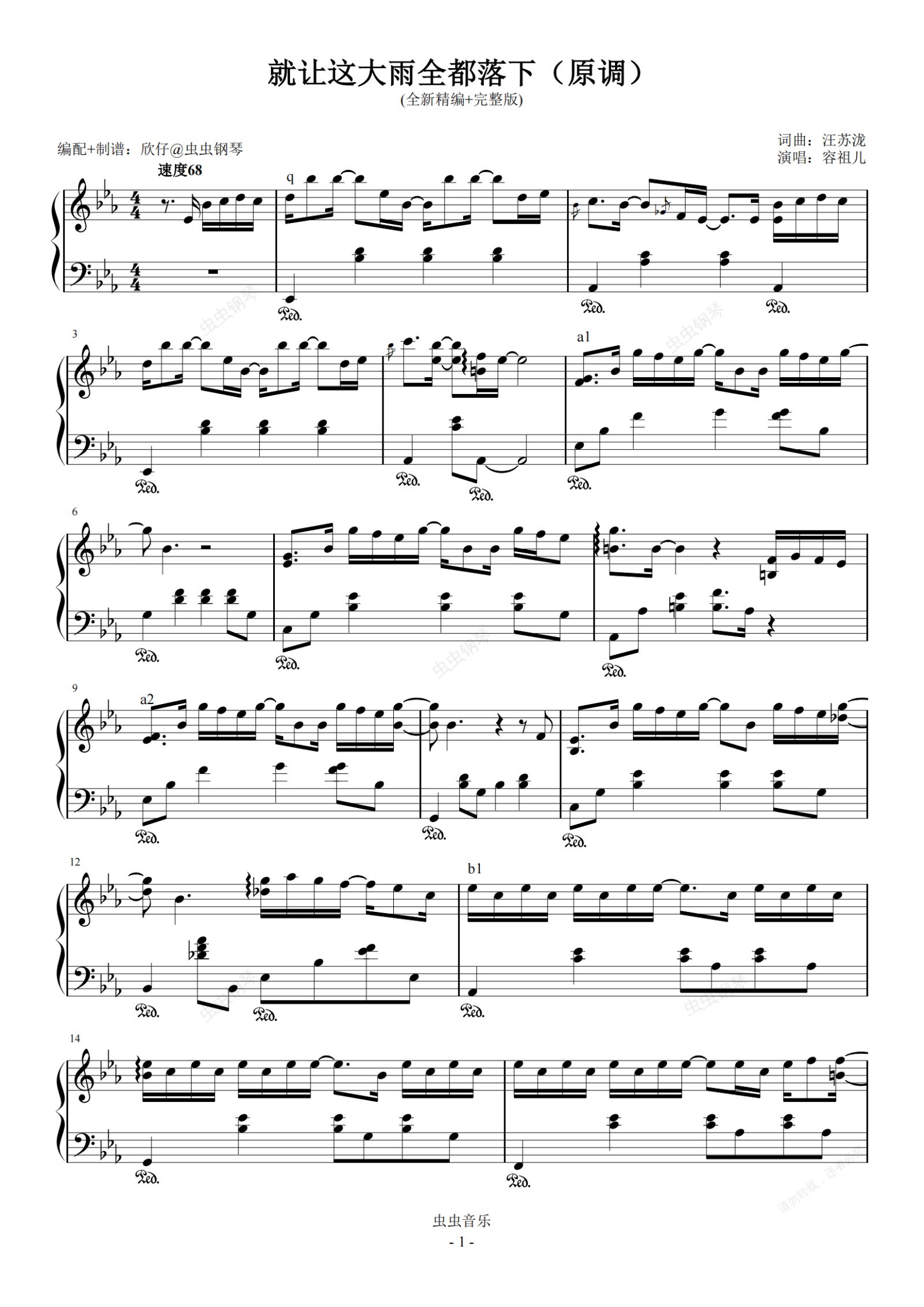 钢琴谱:容祖儿-降E转E《就让这大雨全都落下》(全新精编+完整版)