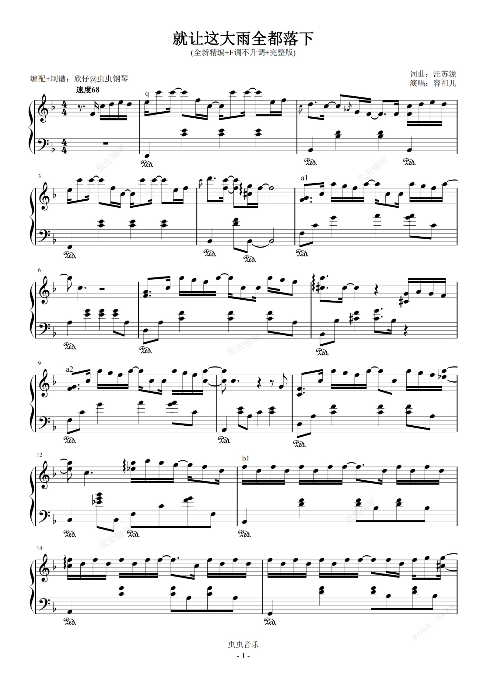 钢琴谱:容祖儿-F不升调《就让这大雨全都落下》(全新精编+完整版)