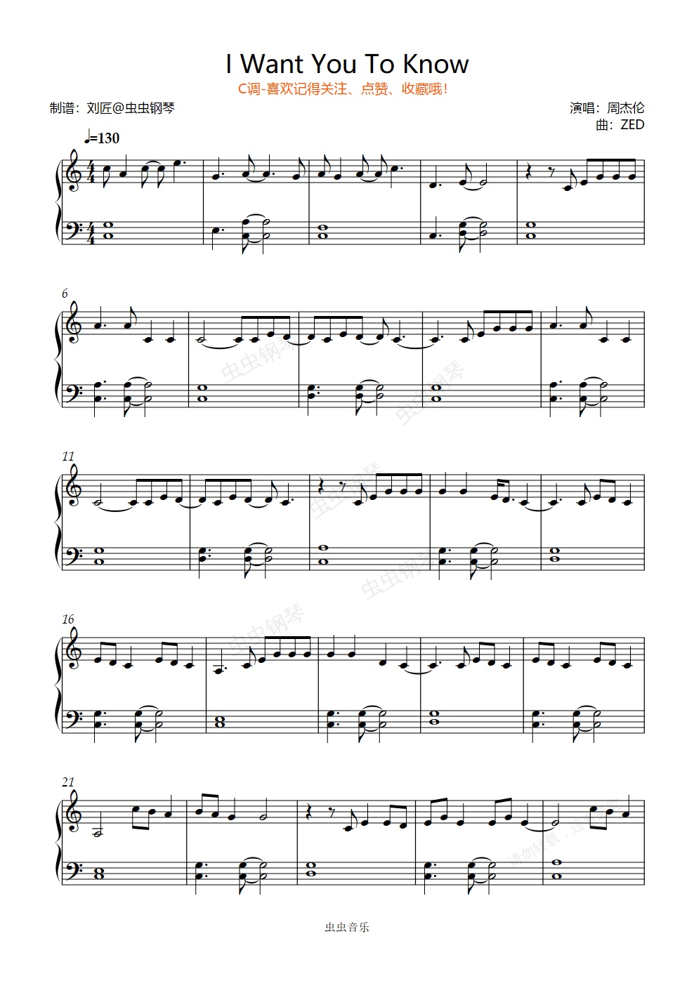 钢琴谱:【易上手】《I Want You To Know》-刘匠编配-C调