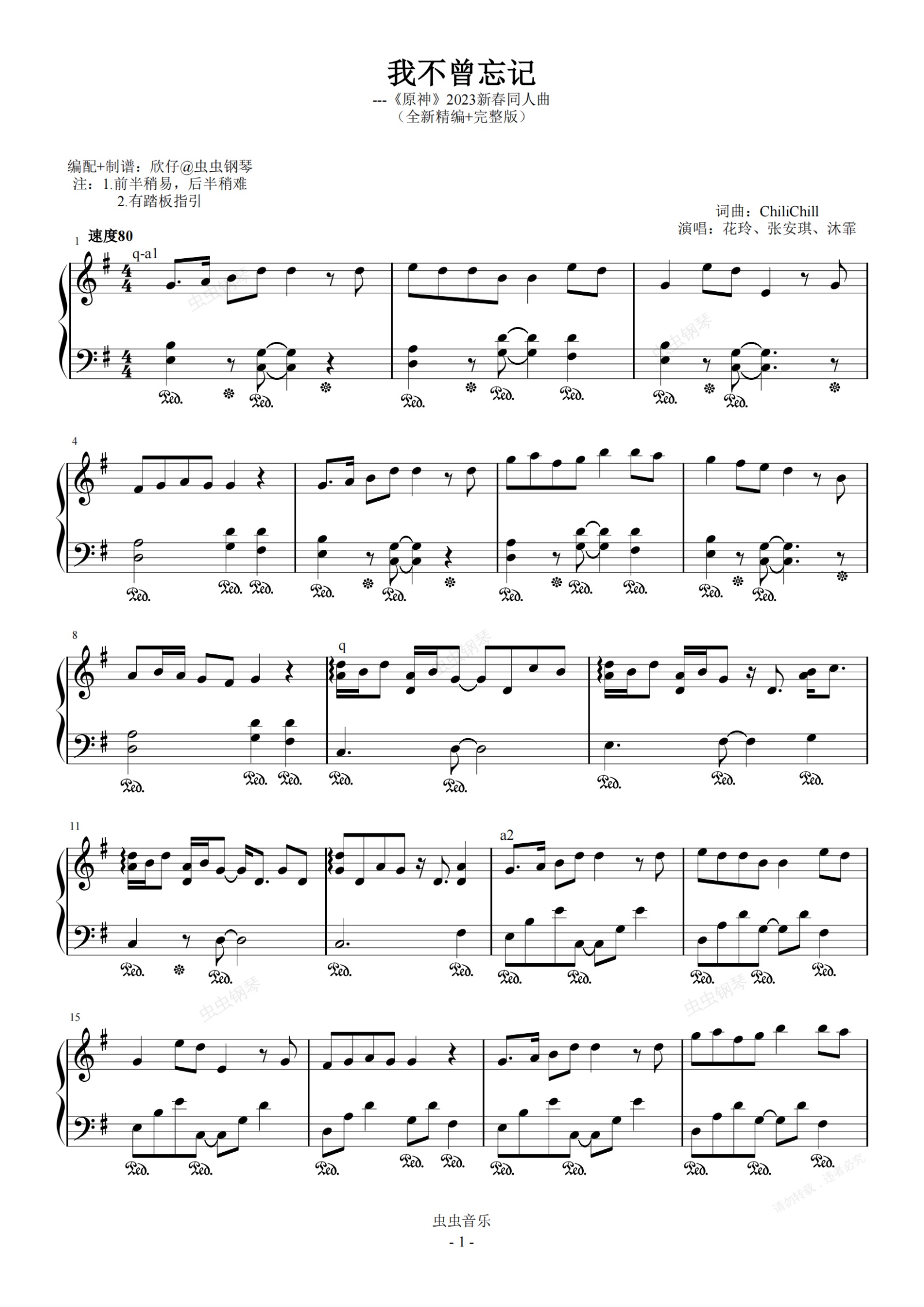钢琴谱:G《我不曾忘记》(全新精编+完整版)