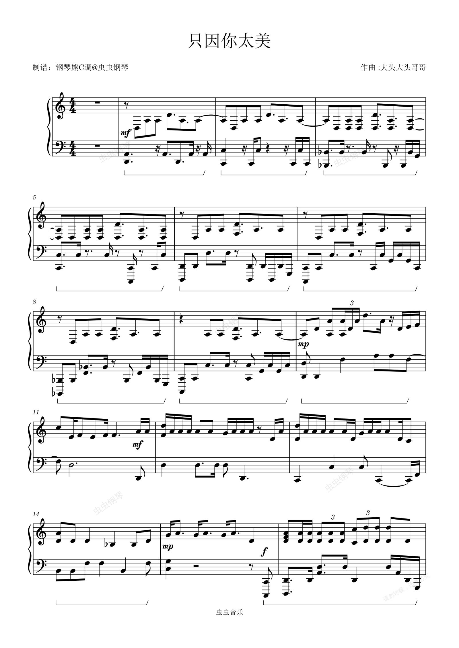 钢琴谱:C大调《只因你太美》泽野弘之版 喜欢的兄弟记得点收藏哦~👇👇👇♥♥♥大头哥哥永远的神!