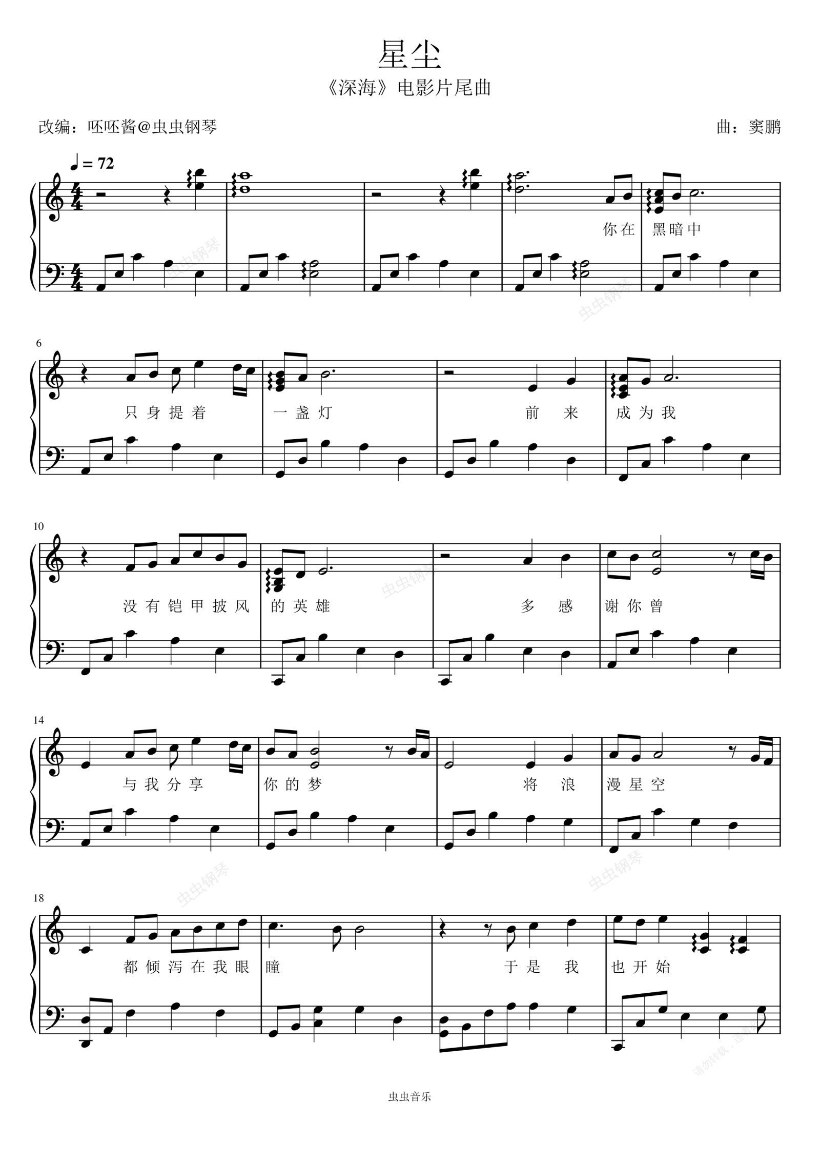 钢琴谱:星尘C调-《深海》电影片尾曲-钢琴独奏-【还原+改编版】