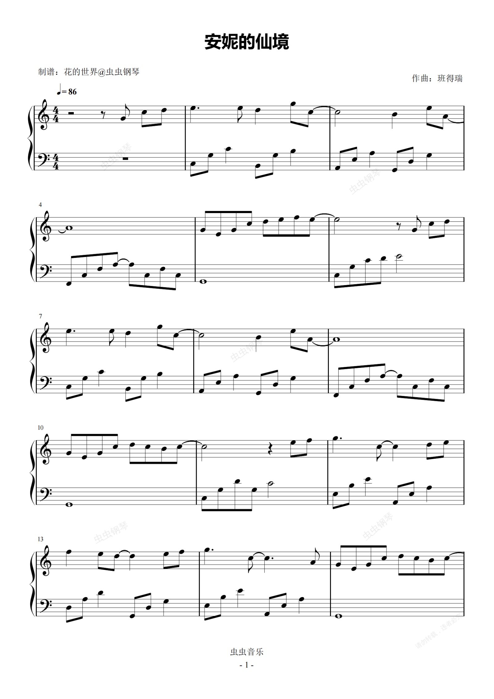 钢琴谱:安妮的仙境 C调简易版 班得瑞