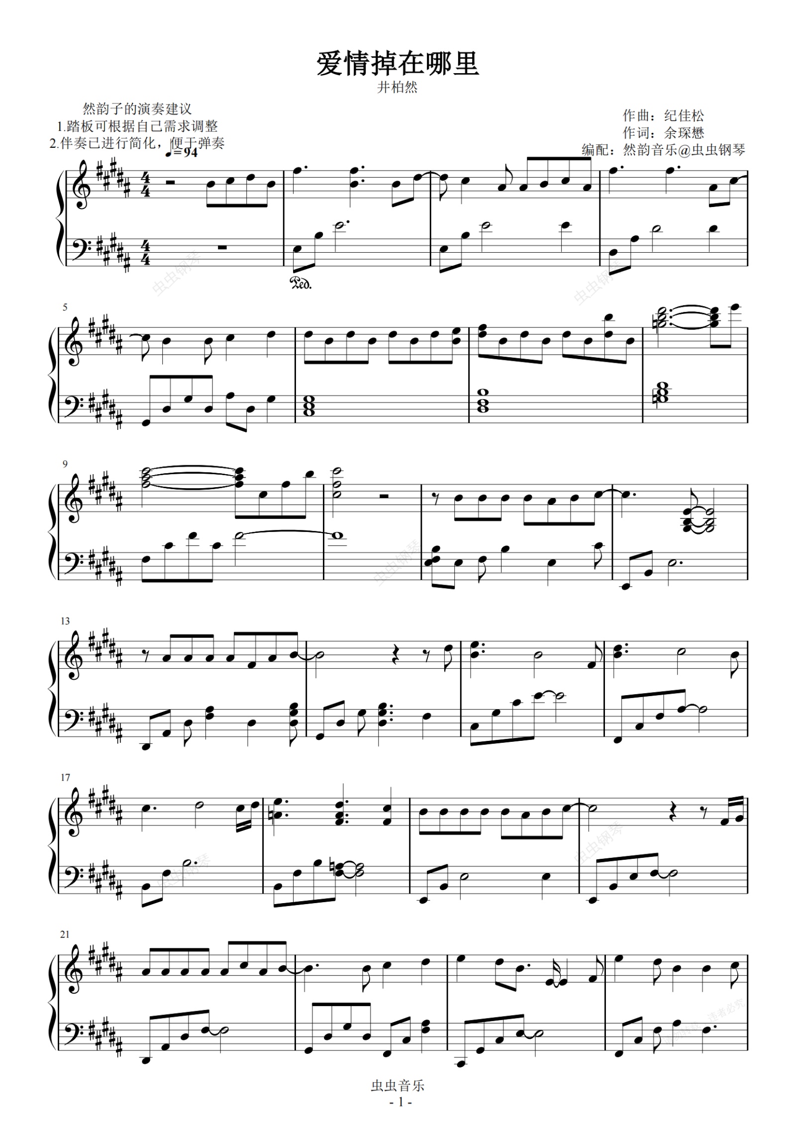 钢琴谱:【原调】爱情掉在哪里-井柏然 钢琴完美还原