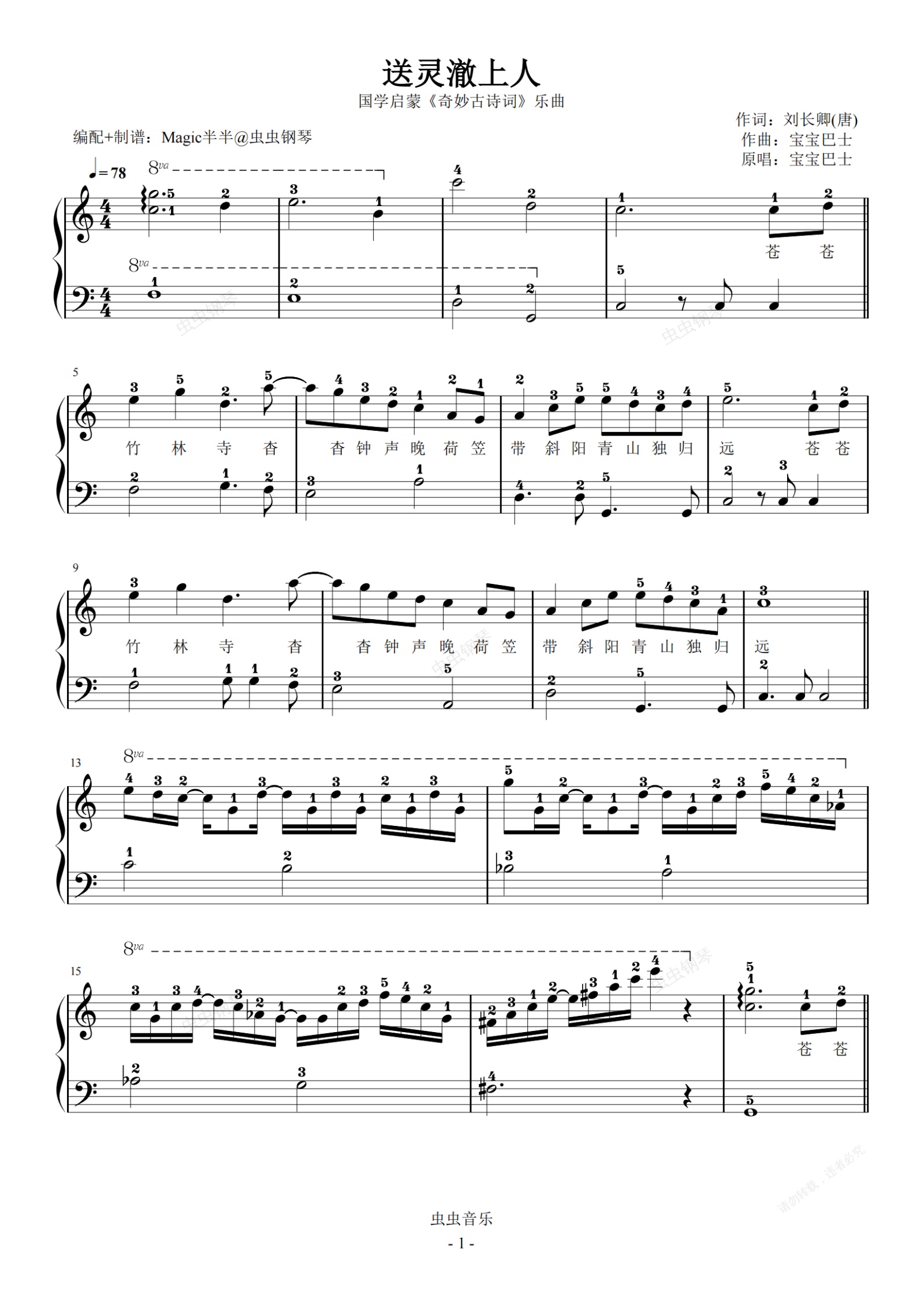 钢琴谱:奇妙古诗词/送灵澈上人(带指法)