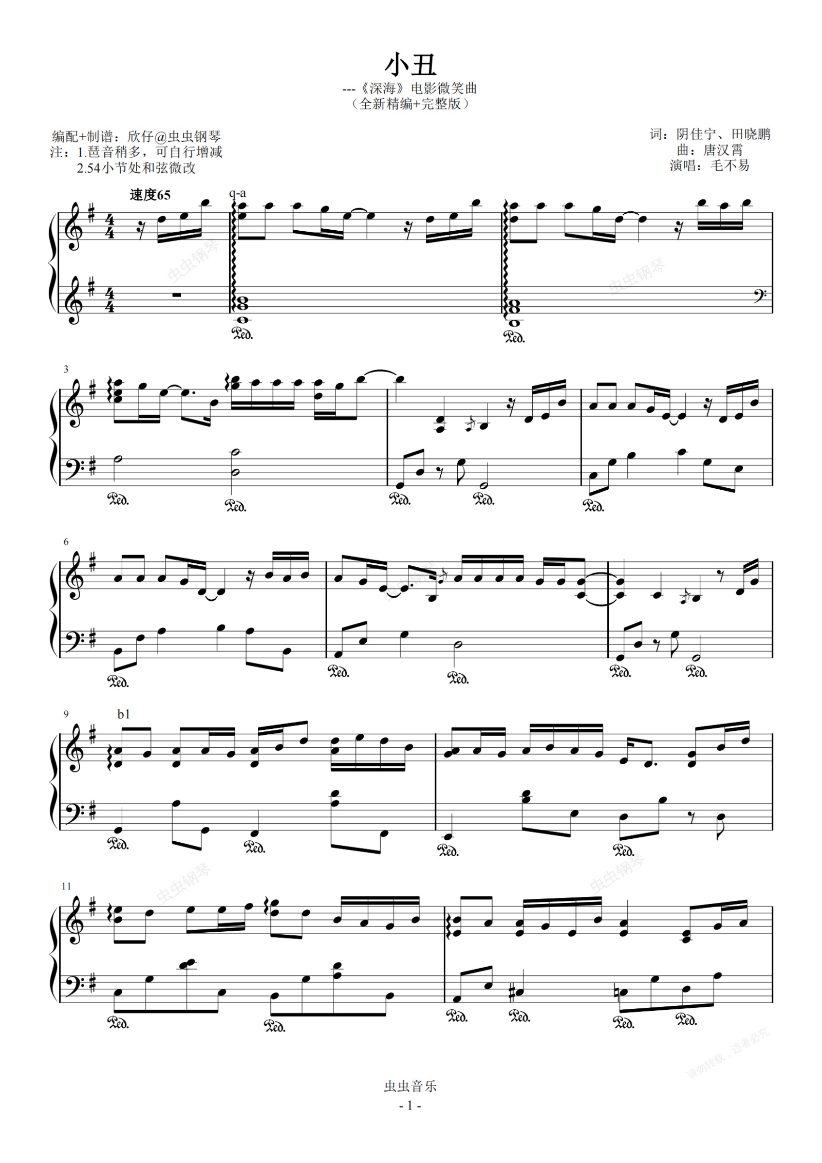 钢琴谱:毛不易-G《小丑》(《深海》电影微笑曲、完整版)