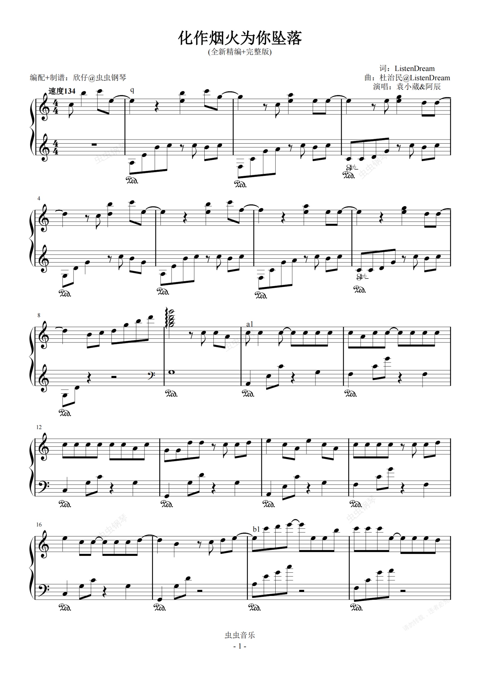 钢琴谱:C-《化作烟火为你坠落》(全新精编+完整版)