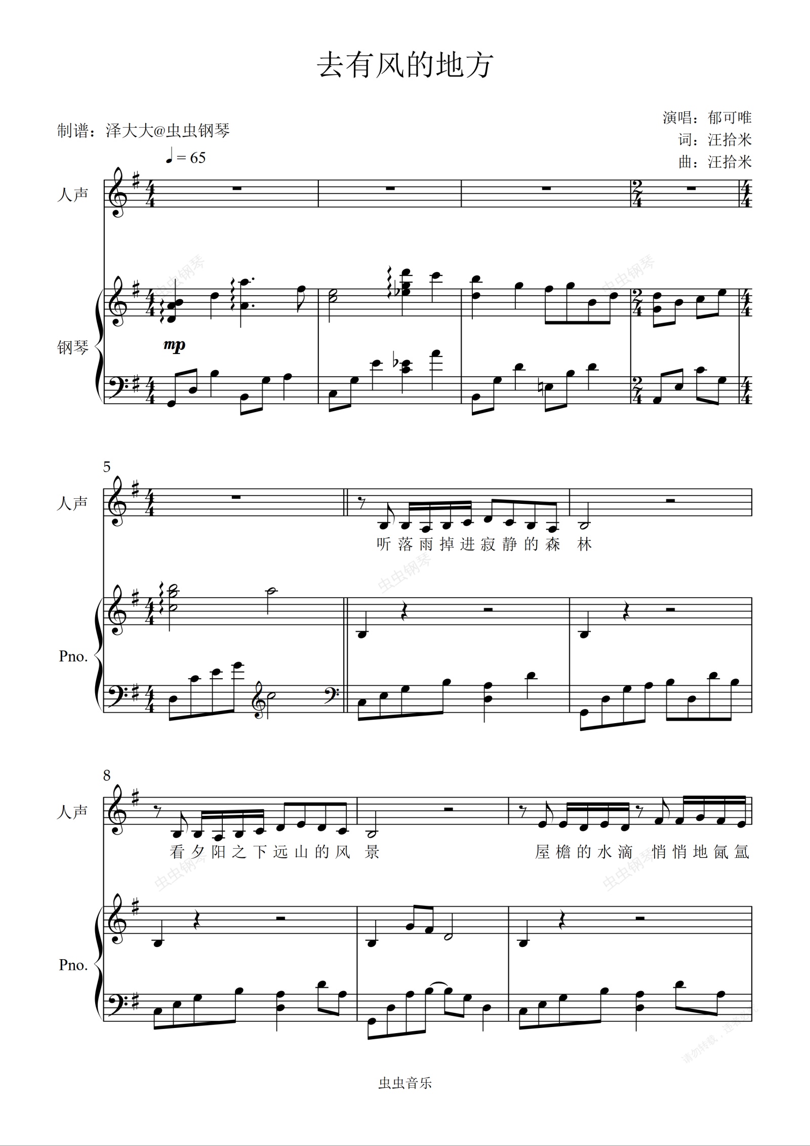 钢琴谱:去有风的地方【原版弹唱附词】泽大大 郁可唯