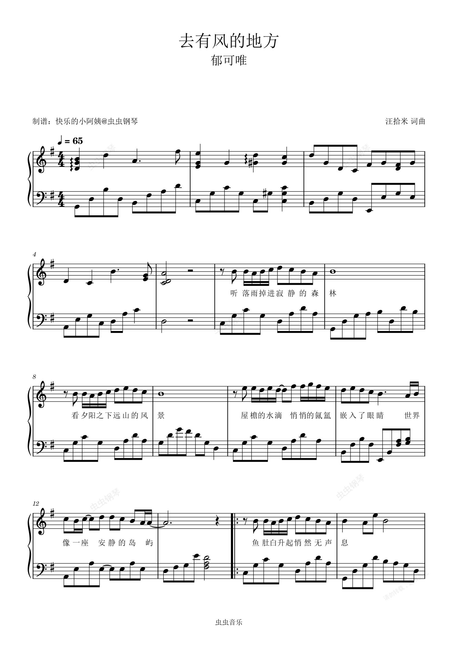 钢琴谱:去有风的地方-郁可唯-附歌词