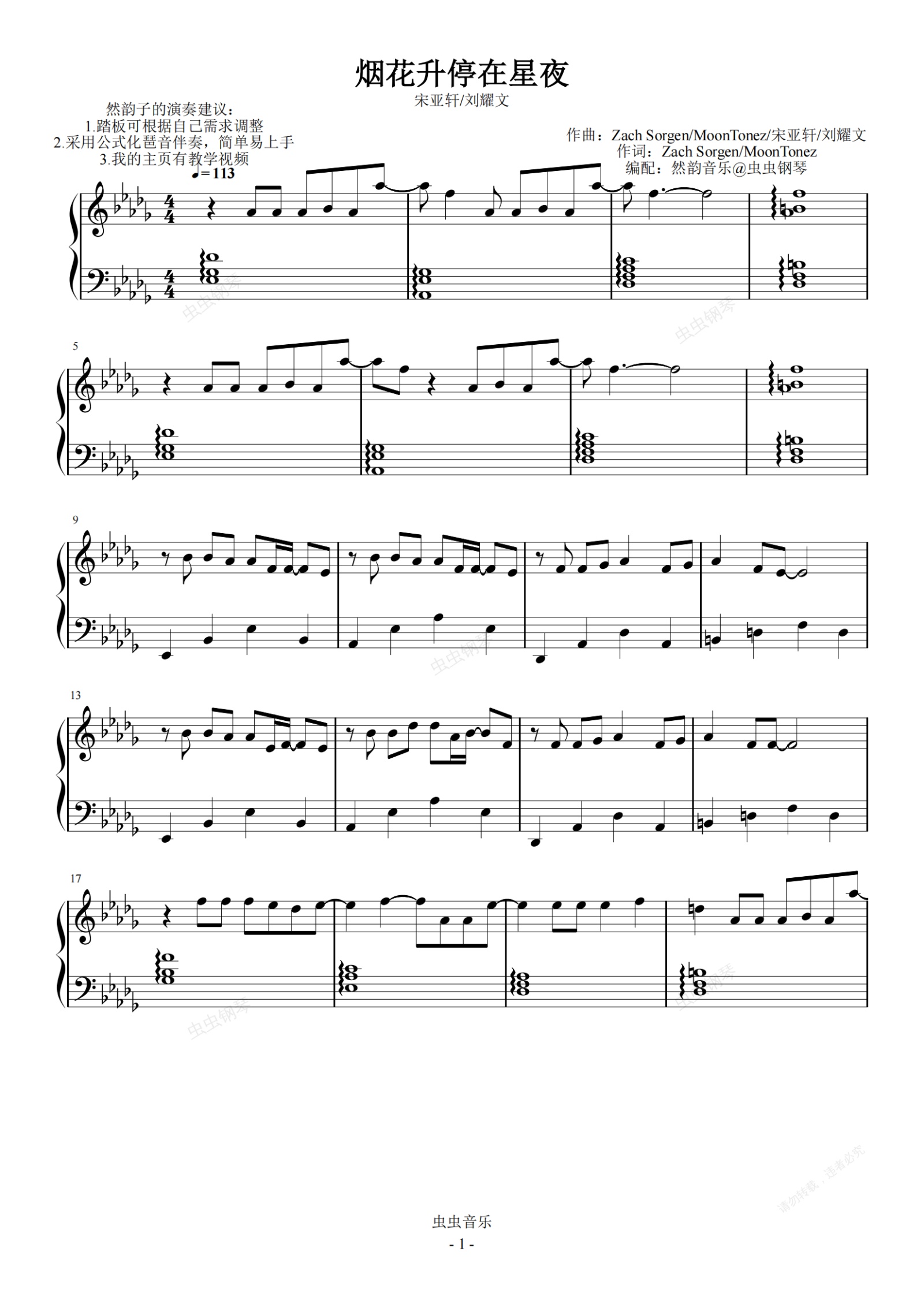 钢琴谱:【原调特惠】烟花升停在星夜-宋亚轩/刘耀文 简单易学版
