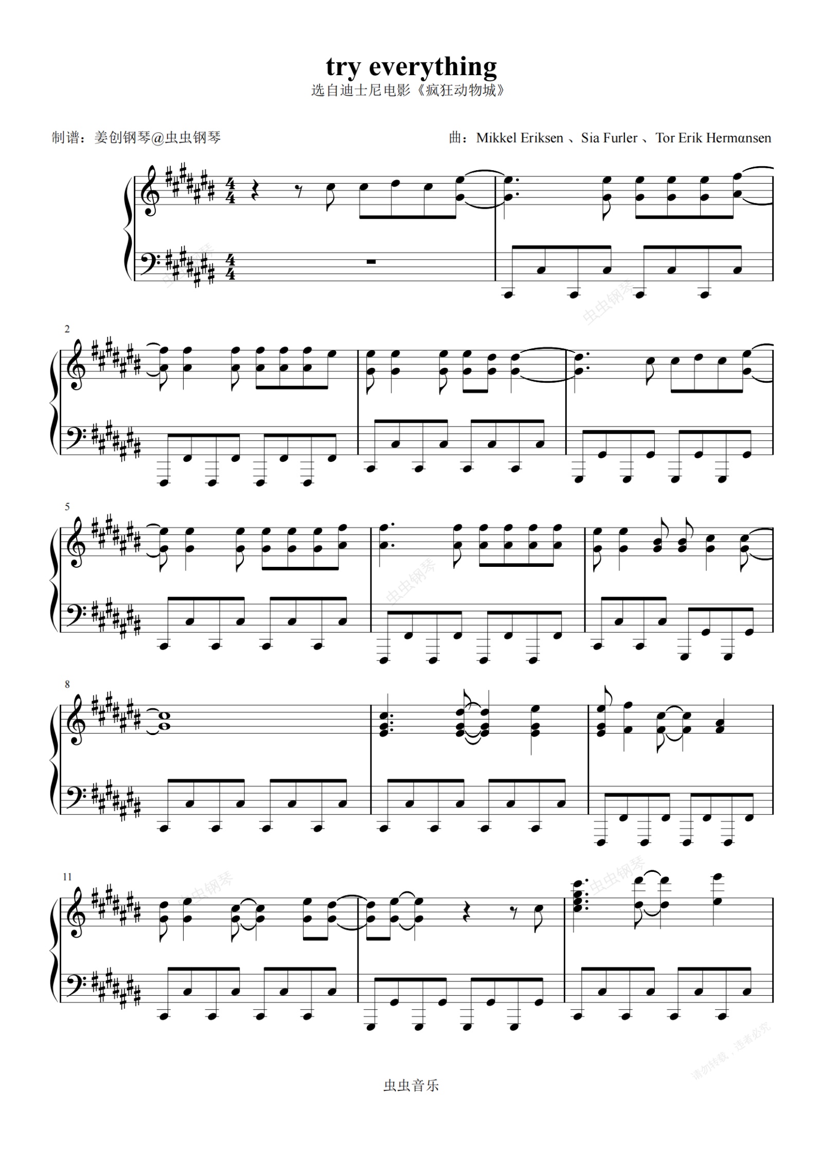 钢琴谱:疯狂动物城《try everything》完美演奏版