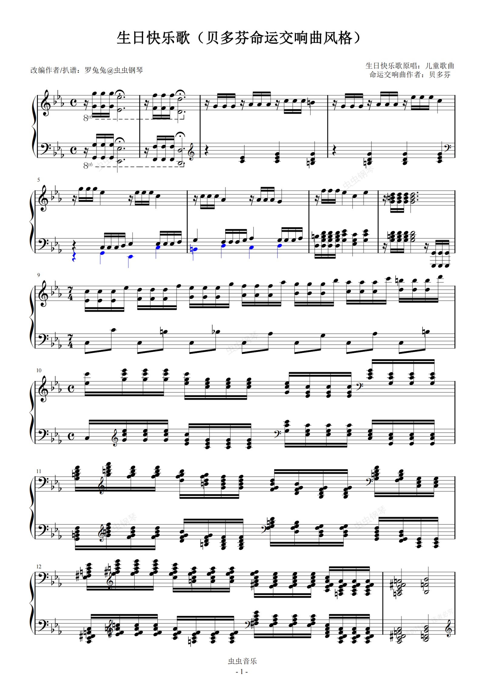 钢琴谱:生日快乐歌(贝多芬命运交响曲风格)