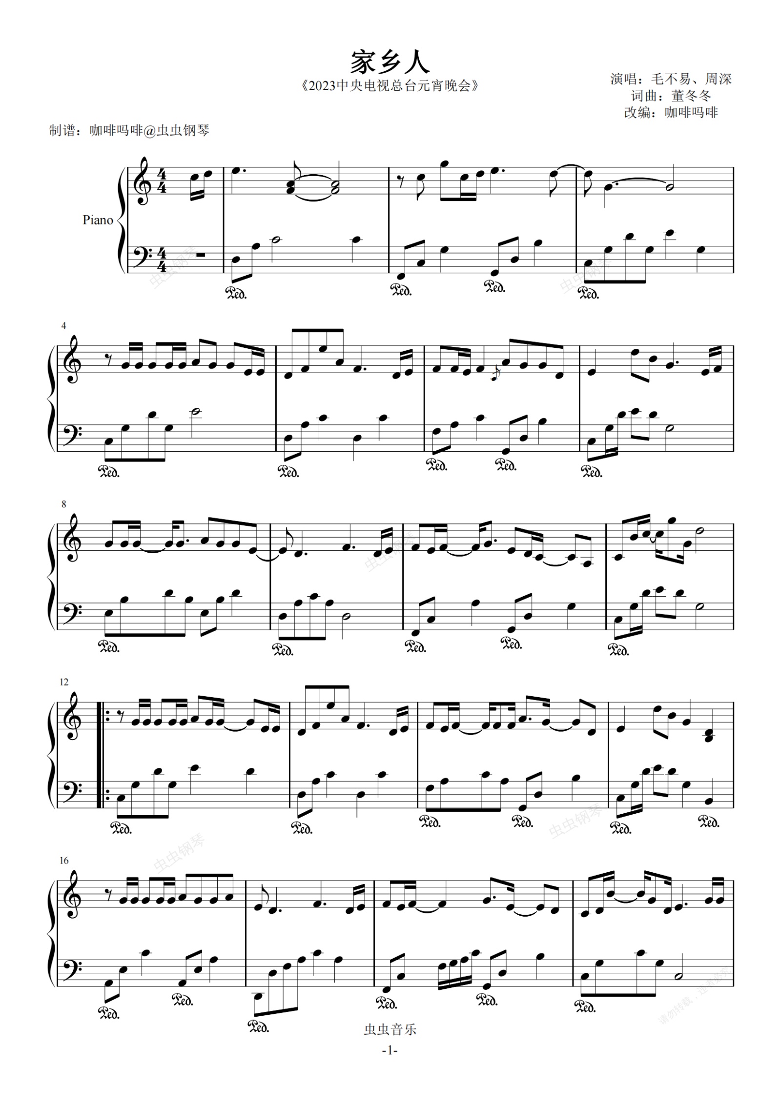 钢琴谱:家乡人-毛不易、周深C调钢琴谱