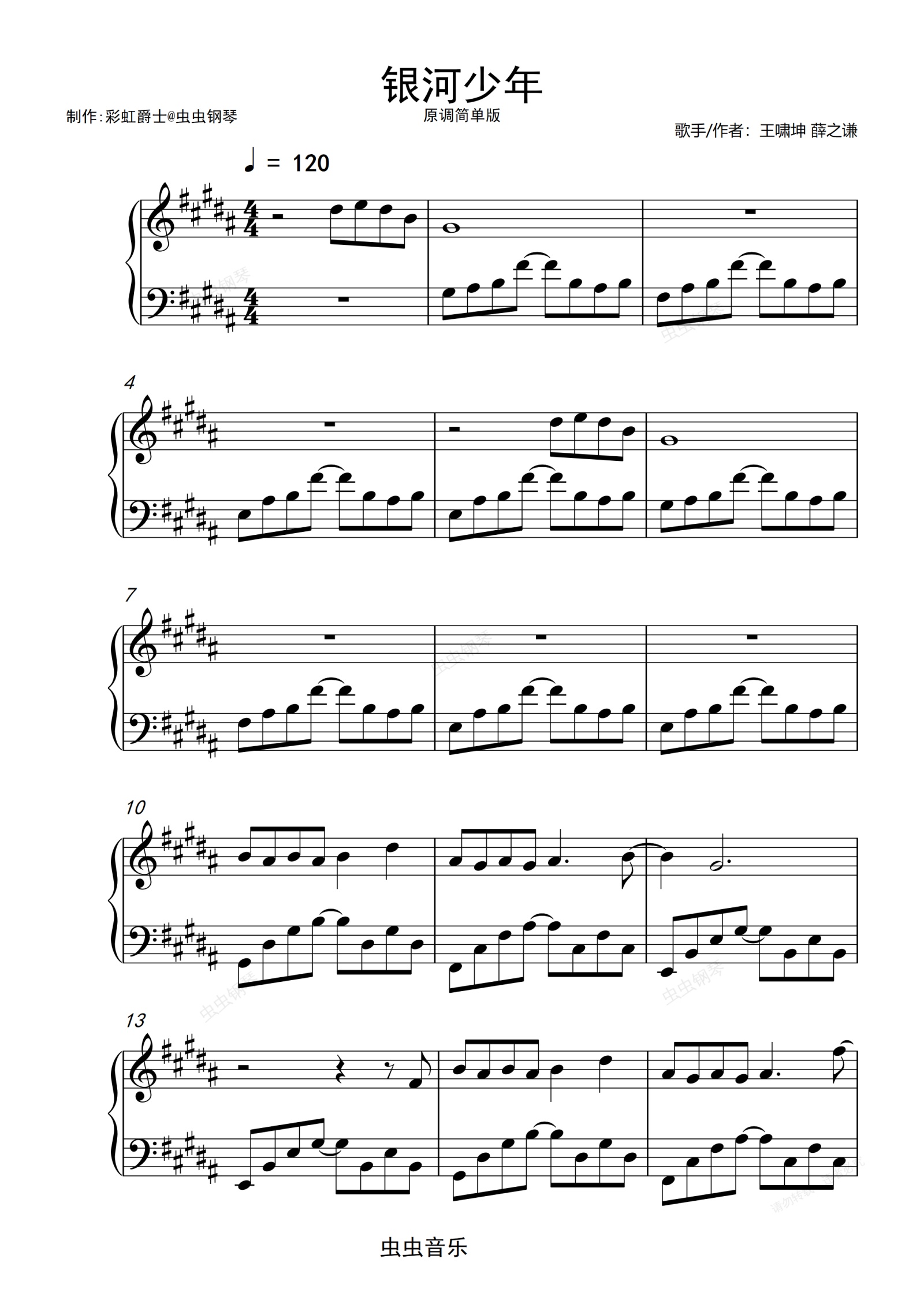 钢琴谱:银河少年-原调简单版 王啸坤 薛之谦
