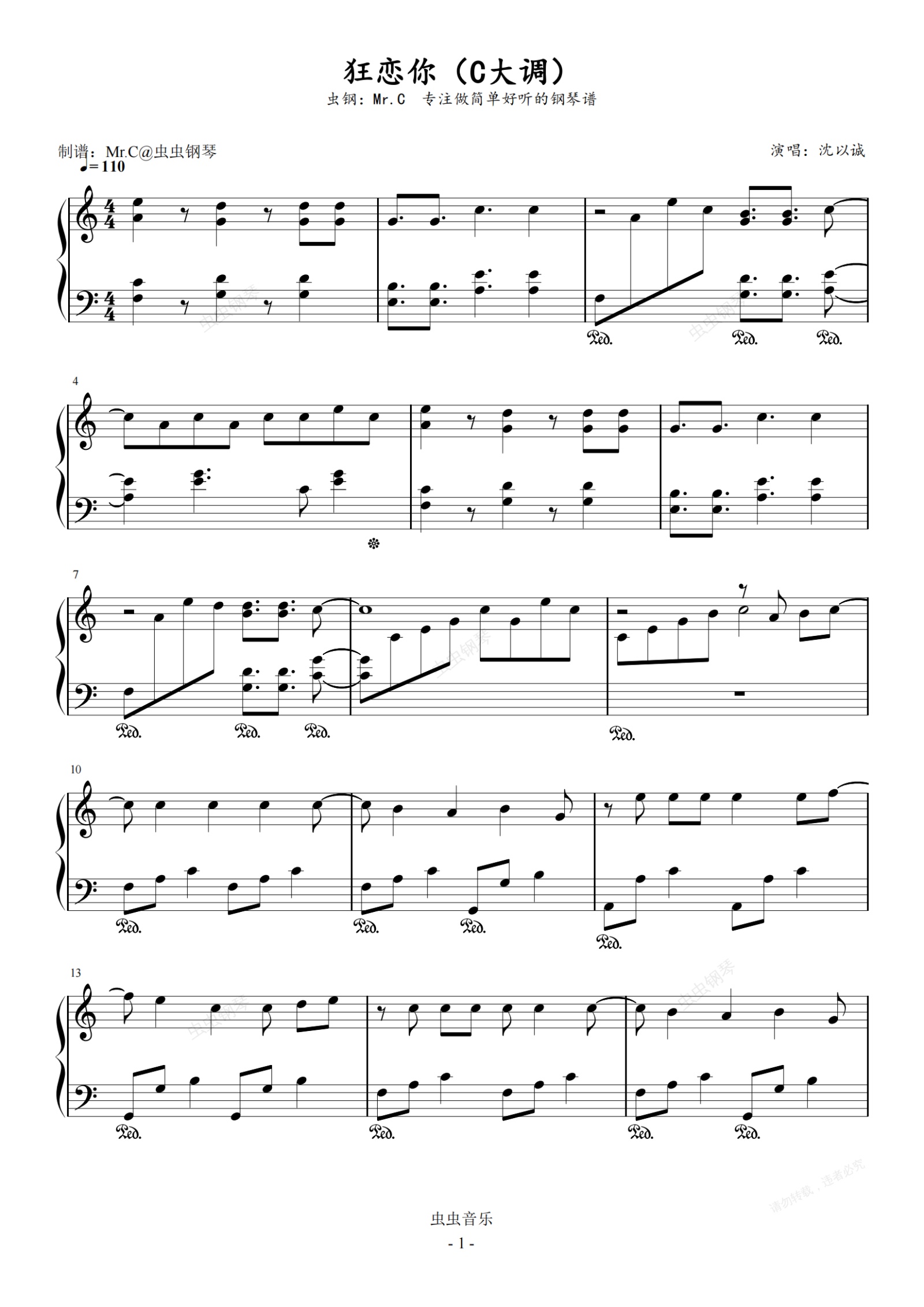钢琴谱:狂恋你-沈以诚 C调初学者版