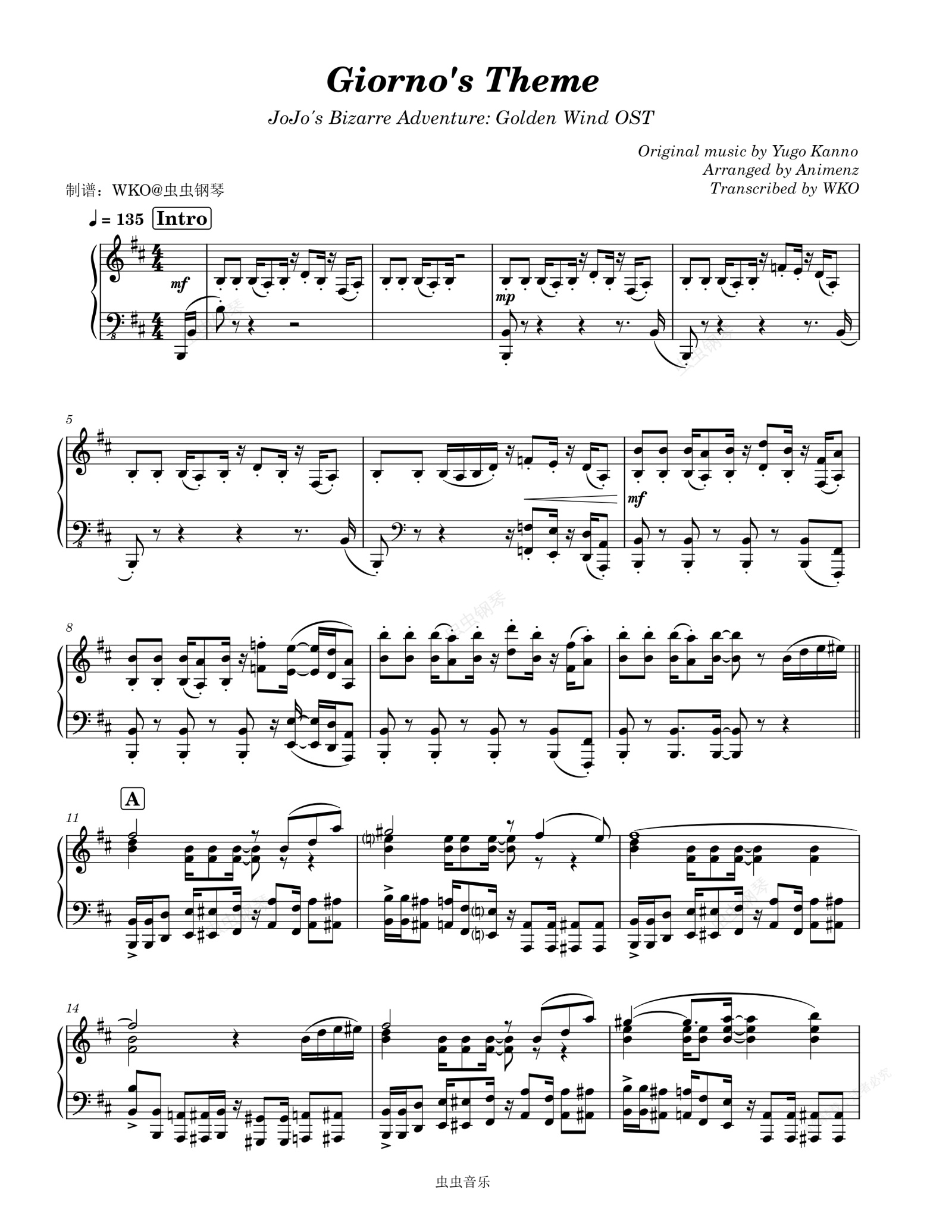 钢琴谱:黄金之风 乔鲁诺主题曲