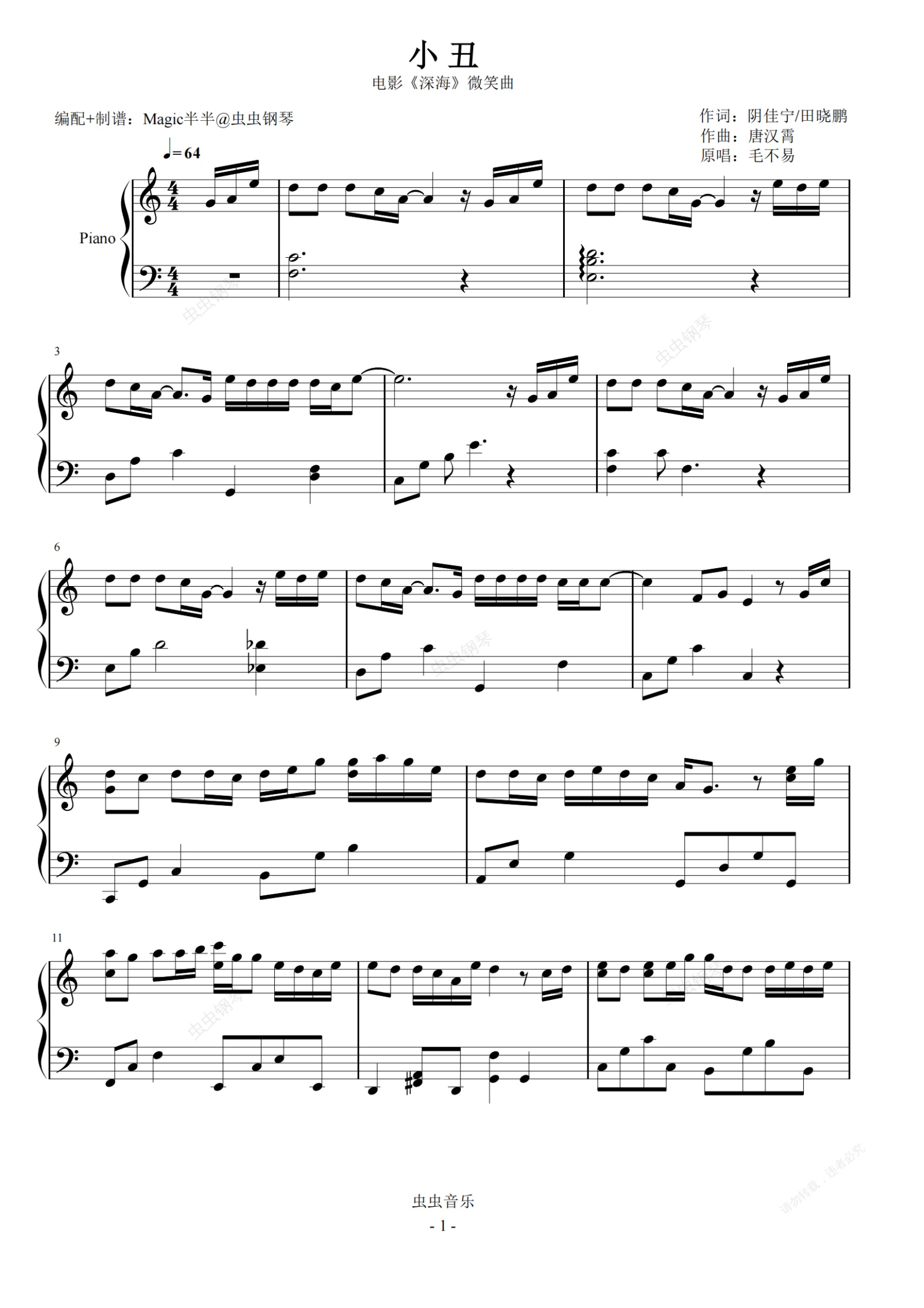 钢琴谱:小丑 毛不易(C调完整版) 电影<深海>微笑曲