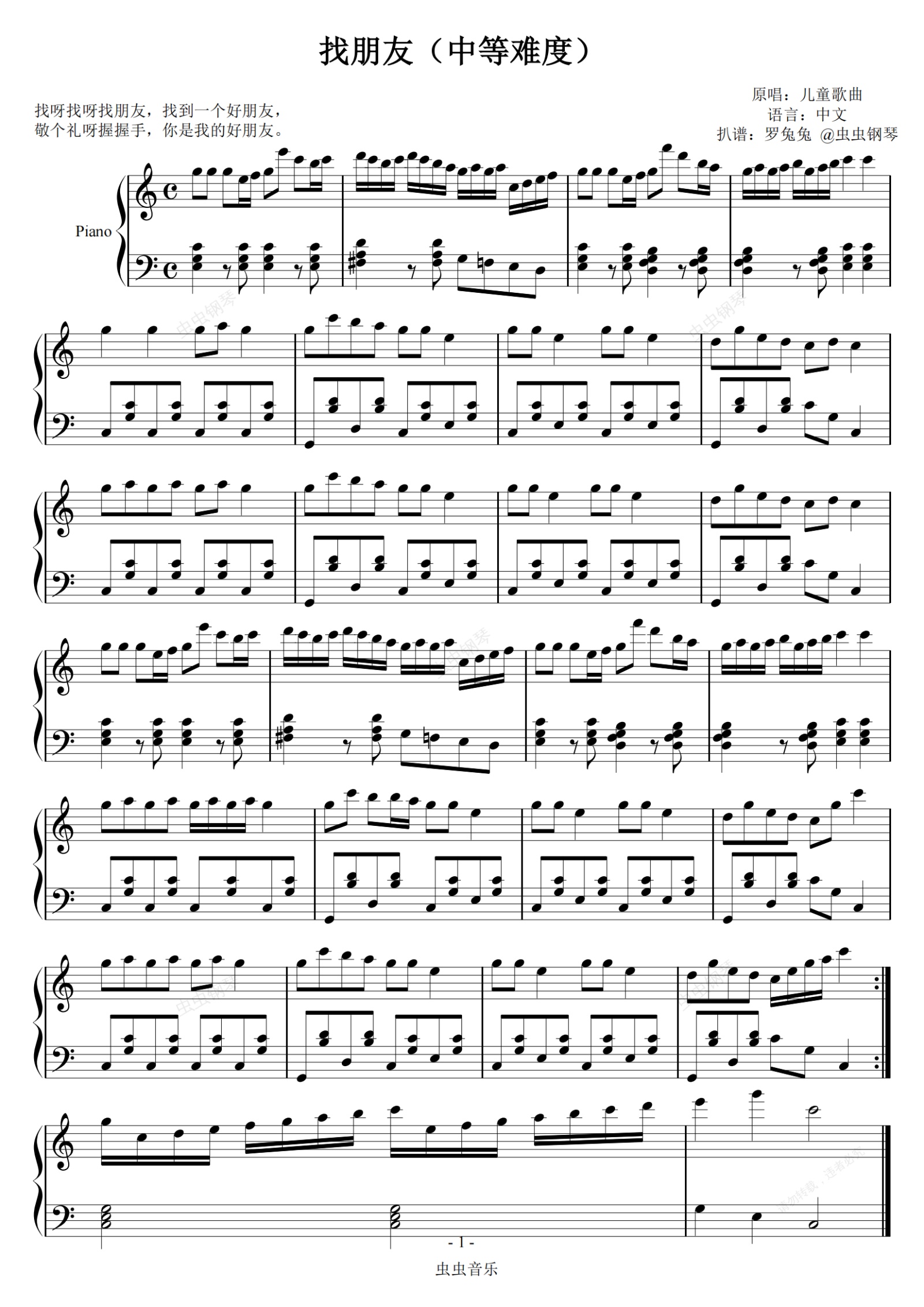 钢琴谱:找朋友(中等难度)