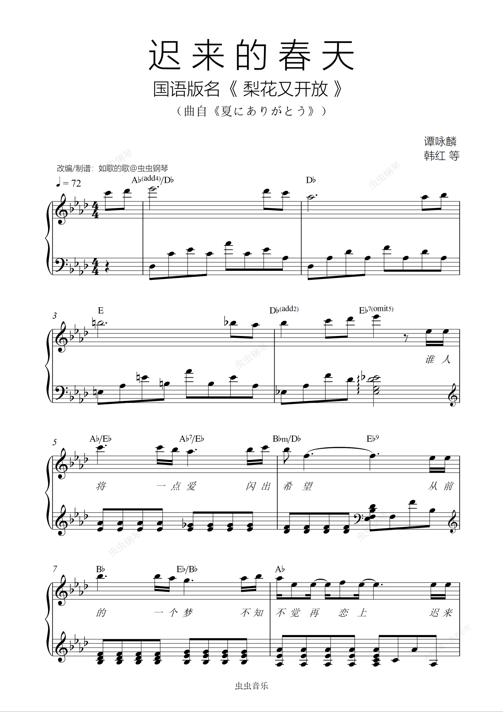 钢琴谱:迟来的春天(梨花又开放,夏にありがとう)可弹唱