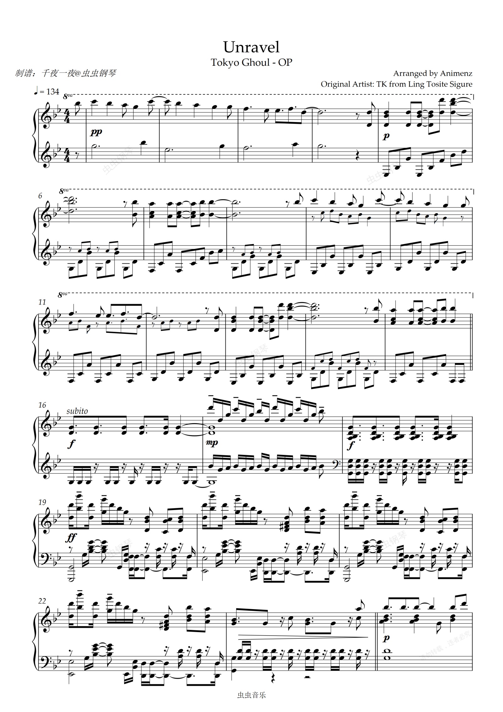 钢琴谱:【Animenzzz】Unravel - Tokyo Ghoul 东京喰种OP [piano]