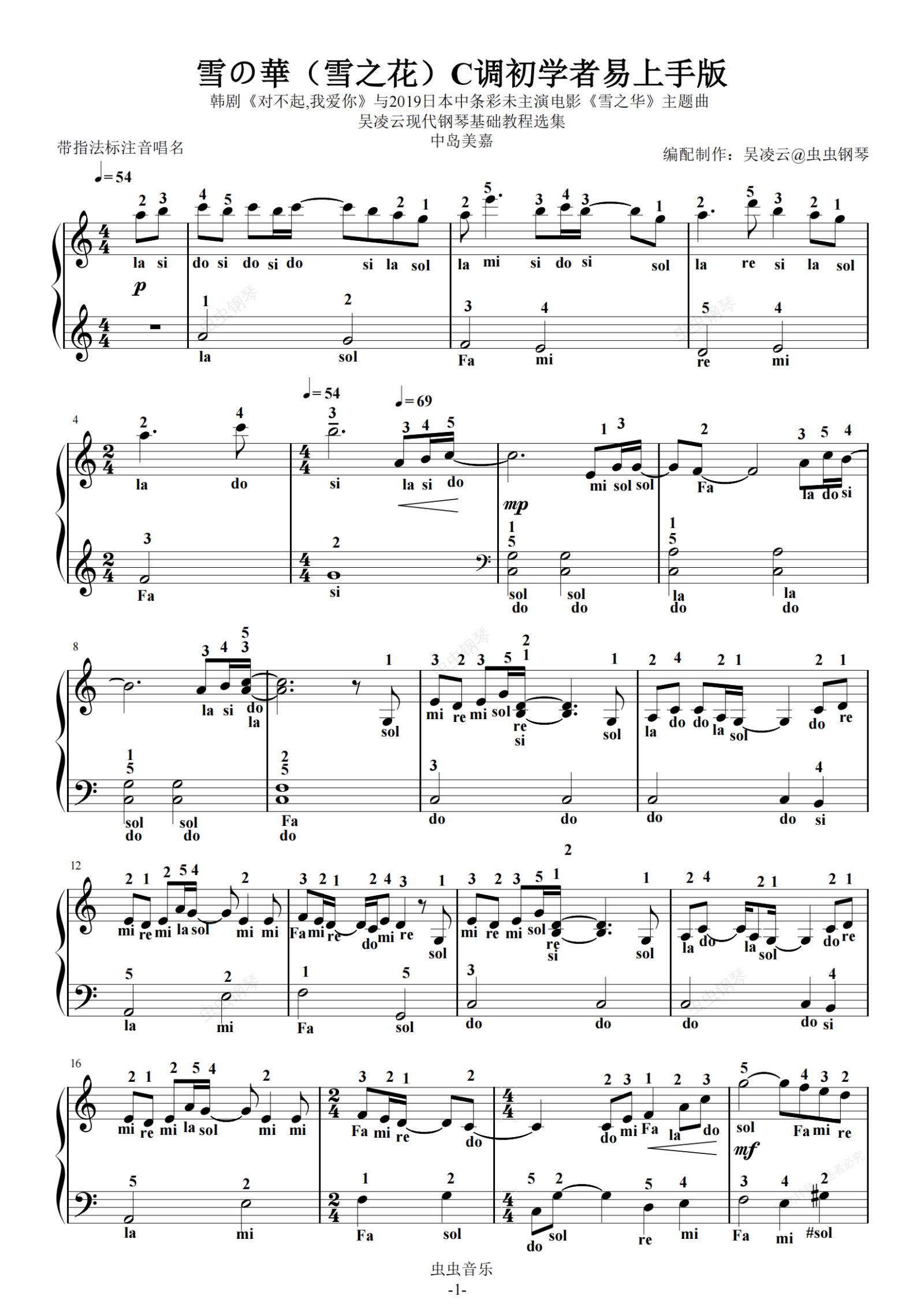 钢琴谱:雪の華(雪之花)C调初学者易上手版 指法+唱名 吴凌云现代钢琴基础教程选集