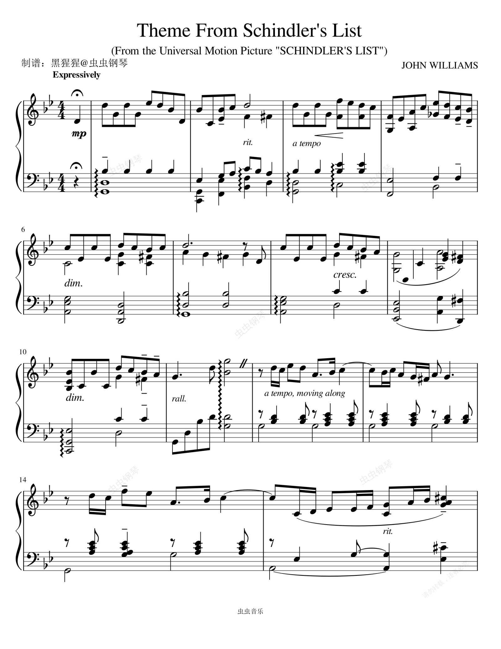 钢琴谱:《辛德勒的名单》主题 约翰·威廉姆斯 B♭调