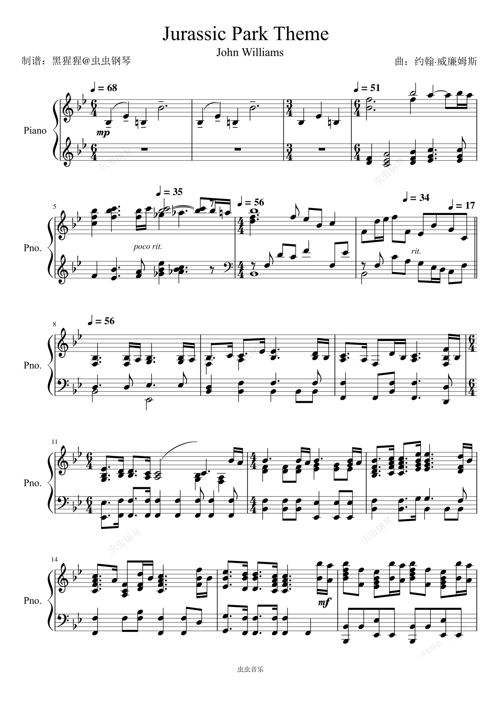 钢琴谱:侏罗纪公园主题 约翰·威廉姆斯 B大调 原声带