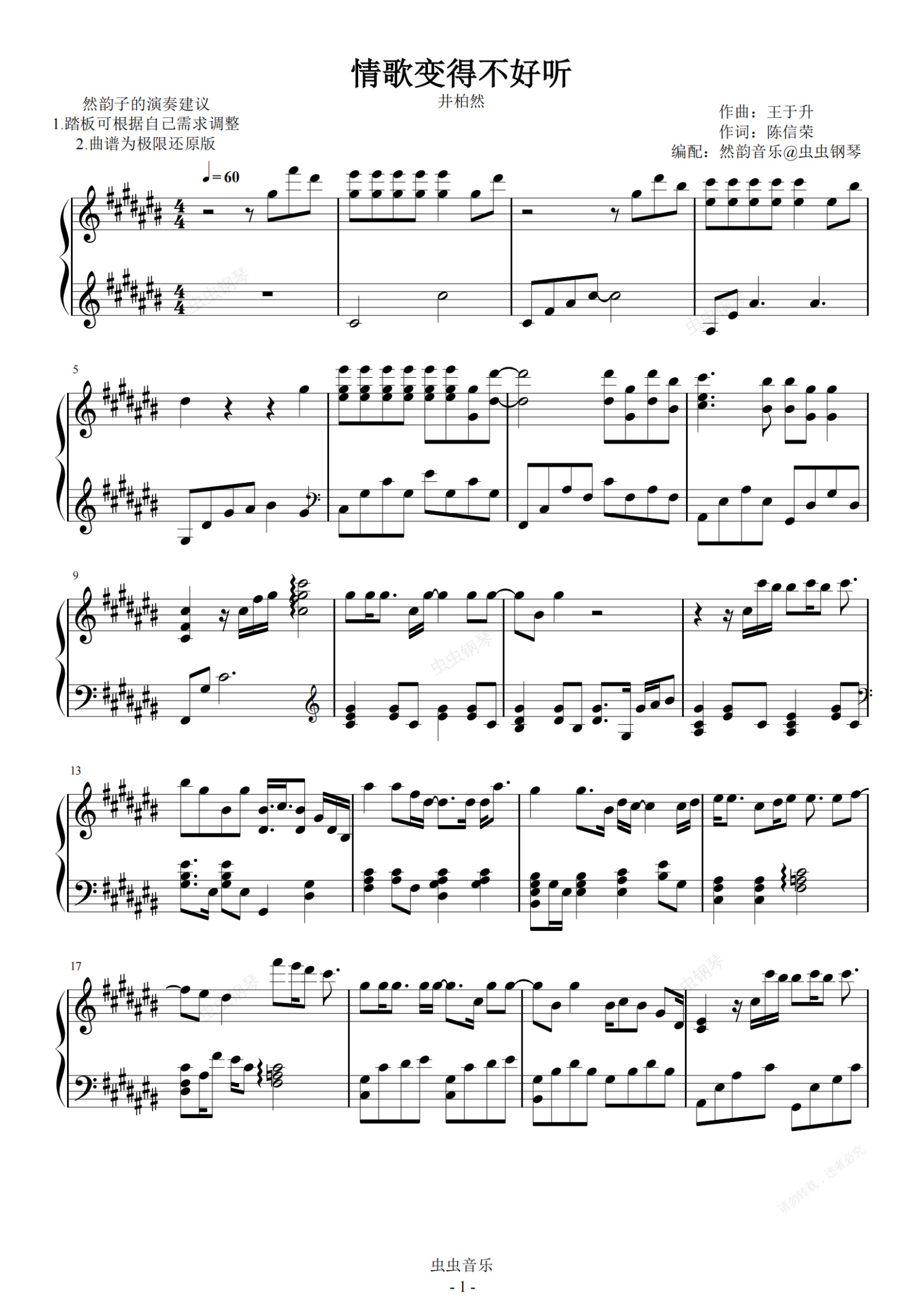 钢琴谱:【原调】情歌变得不好听-井柏然 极限还原版